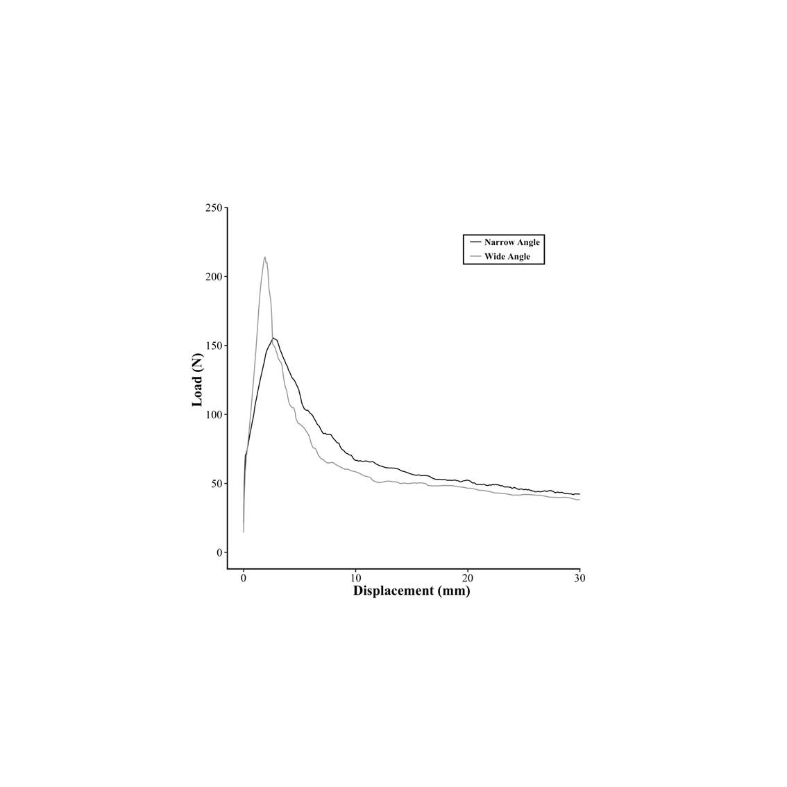 There were marked differences in the shapes of the force displacement curves for wedges of different angles. For low angles, the force rose relatively slowly at first, reaching a maximum at 2- 5 mm, and only fell slowly thereafter (See Figure 7). In contrast, for the high angles the force rose more rapidly to a higher peak at a displacement of only 1-2 mm, but fell much more rapidly after that. The two sets of curves therefore crossed over each other as predicted by theory (See Figure 7).