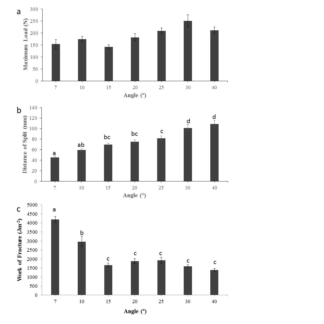 There were also differences in the maximum force required between wedges of different angle (See Figure 8a); blades with higher angles required in general a greater maximum force. A one- way ANOVA showed that these differences were highly significant (F6,63 = 5.60, p < 0.0005), Tukey tests showing that the maximum force for the 30° wedge was significantly higher than those at 7° (p = 0.001), 10° (p = 0.018), 15° (p < 0.005), and 20° (p = 0.045), while the maximum force for the 40° wedge was significantly higher than the 15° wedge (p = 0.044).