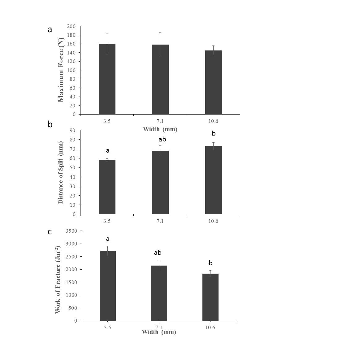 There was no significant difference in the maximum force required between blades of different width (See Figure 9a) (F2,27 = 0.14, p = 0.872). There were however, significant differences in the distance the cracks were driven (See Figure 9b) (F2,27 = 3.62, p = 0.041); Tukey tests showed that the 10.6 mm wedge drove cracks significantly longer than the 3.5 mm wide wedge (p = 0.023). There were also significant differences in the energy required per unit area of split (See Figure 9c) (F2,27 = 6.91, p = 0.004); in particular the mean energy per unit area for the 3.5 mm wide wedge was 48% higher than the 10.6 mm wide wedge, a difference that a Tukey test showed was significant (p = 0.003).
