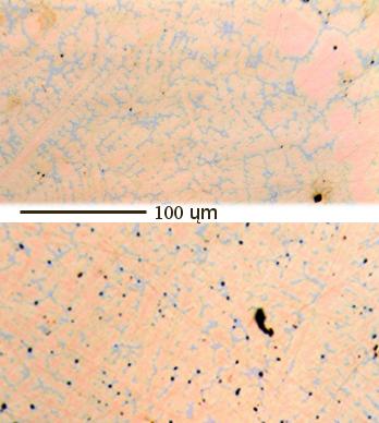 The samples were taken to the metals and glass lab of the University of Sheffield where they were analysed using a Niton portable XRF analyser. It was found that over the course of eight melt cycles there was no detectable loss of tin (See Table 1. Note that the initial reading in each table shows the metal before recycling). Polished samples of the metal were then mounted and examined. The microstructural analysis found no evidence for tin oxide crystals or the presence of a copper-copper oxide eutectic. Well-developed dendrites were visible in all the samples under magnification, with the only variations being the size of the dendrites, which is indicative of the different cooling times of the individual pours (See Figure 1). These results are in contrast to modern foundry practice using electric or gas furnaces where oxidation occurs in concentrations on the surface of the alloy (Cottrell, 1975; Sohn and Sridhar, 2005).