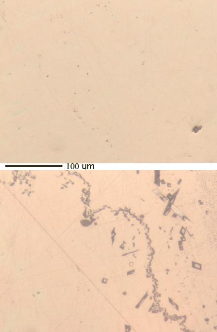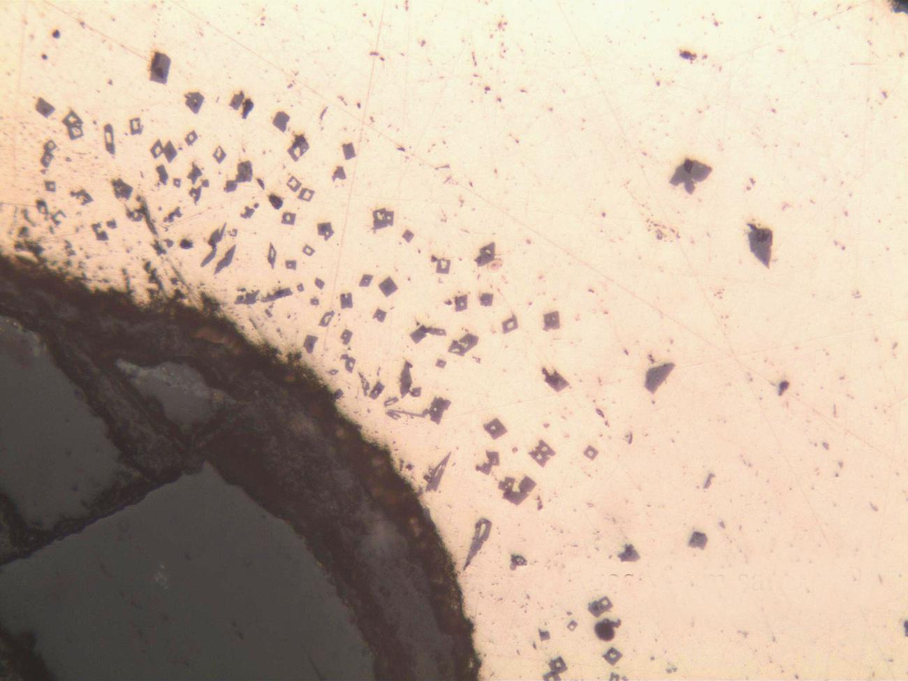 The samples from this experiment were again analysed using the NITON pXRF, and polished samples were mounted for visual examination. It was seen that the percentages of tin were much reduced. At the end of the first melt, the amount of tin had lowered to an average of 4%. The sample from the final melt lost another 1% of tin (See Table 6). However, because pXRF technology does not distinguish between different forms of metal (e.g. metal and metal oxides) the actual percentages of tin were estimated to be lower, since these could be concentrations tin oxide rather than the primary metal. It was observed that there was a higher concentration of tin on the portion of the sample that was originally the surface of the metal. In the visual examination of the polished sample it was seen that tin oxide crystals were found in small clusters and in a band on one side of the sample (See Figure 2). This agreed with the pXRF reading showing the spatial variation of tin concentration. The dross and slag were also examined and it was found that the slag was rich in both copper and tin oxides. In the dross sample, distinct separation bands of tin oxide can be seen without magnification and appear as fine cracks and borders on the polished surface, while the individual crystals of tin oxide that form the separation bands can be seen in detail under magnification (See Figure 3).