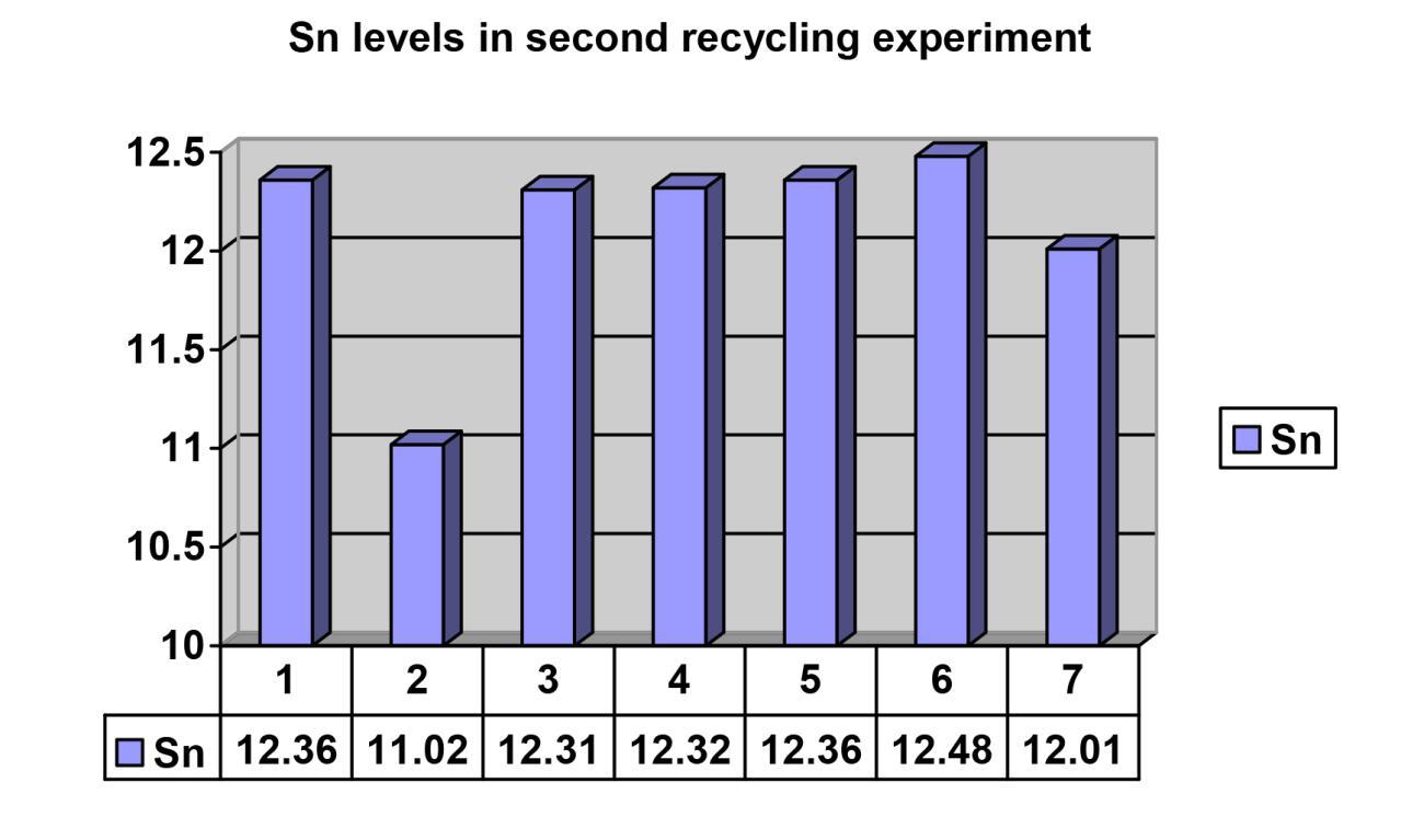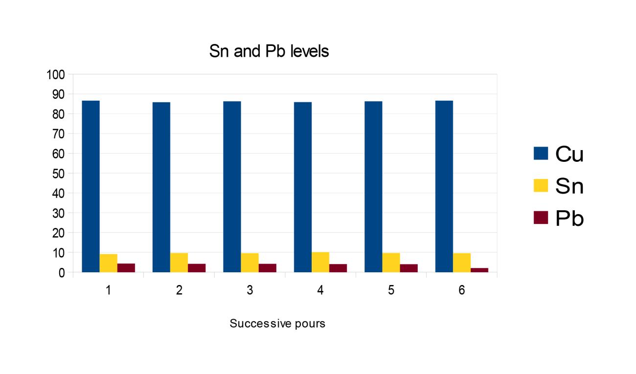The first set of recycling experiments was replicated using a charcoal furnace and bellows, this time using a 90% copper and 10% tin alloy that was purposely mixed for the experiment. A Bruker portable XRF was used for the analyses at the Cambridge University archaeological laboratories, operated by Dr Unavane. The results were substantially the same as in the earlier experiments and no tin was lost during recycling. In addition, the small amount of lead that was part of the alloy was also stable through the recycling episodes (See Table 5).