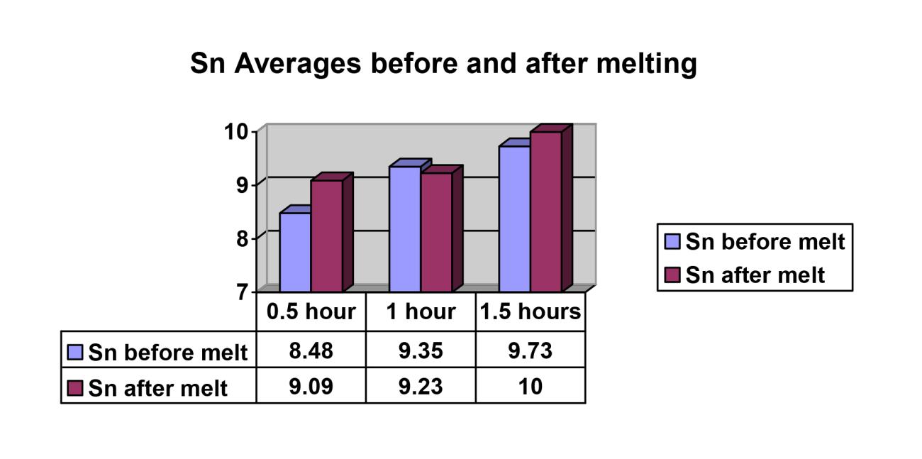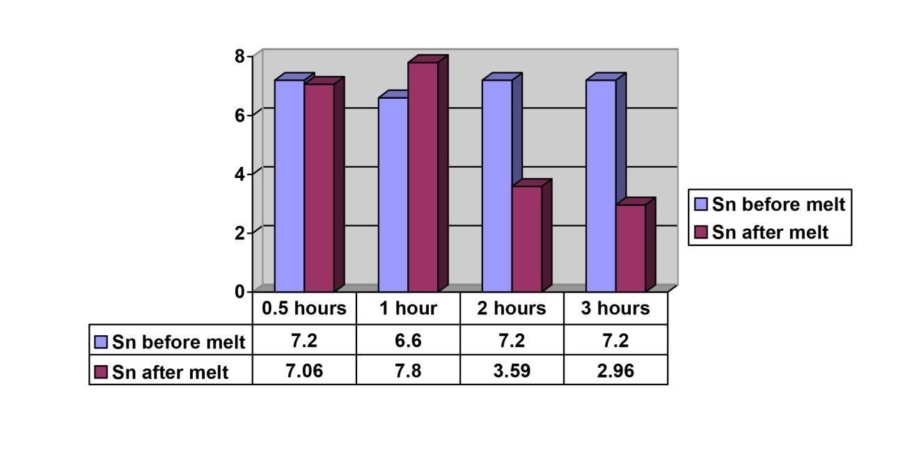 The preliminary conclusion was that there might have been minimal tin loss in a small number of recycling events, and that changes in the alloy might have occurred if recycling took place on a much larger scale. For the third recycling experiment, it was decided to hold three separate batches of bronze in a molten state for prolonged periods of time. A bar of 10% bronze was cut into three sections and placed in separate crucibles. These were then held in a molten state, the first for one-half hour, the second for one hour, and the third piece for one and a half hours. This was done in order to simulate the melting times for several castings. It was estimated that the average time that it took to pour the bronze and return the remainder to the furnace was fifteen seconds, and if the metal would be held in a molten state for one hour, the result could represent over two hundred recycling events. Despite these extended dwell-times at high temperatures in an open hearth, appreciable tin loss could still not be detected (See Table 4). It should be noted that in all of the experiments no dross formed on the surface of the metal and there was no slag remaining in the crucible.