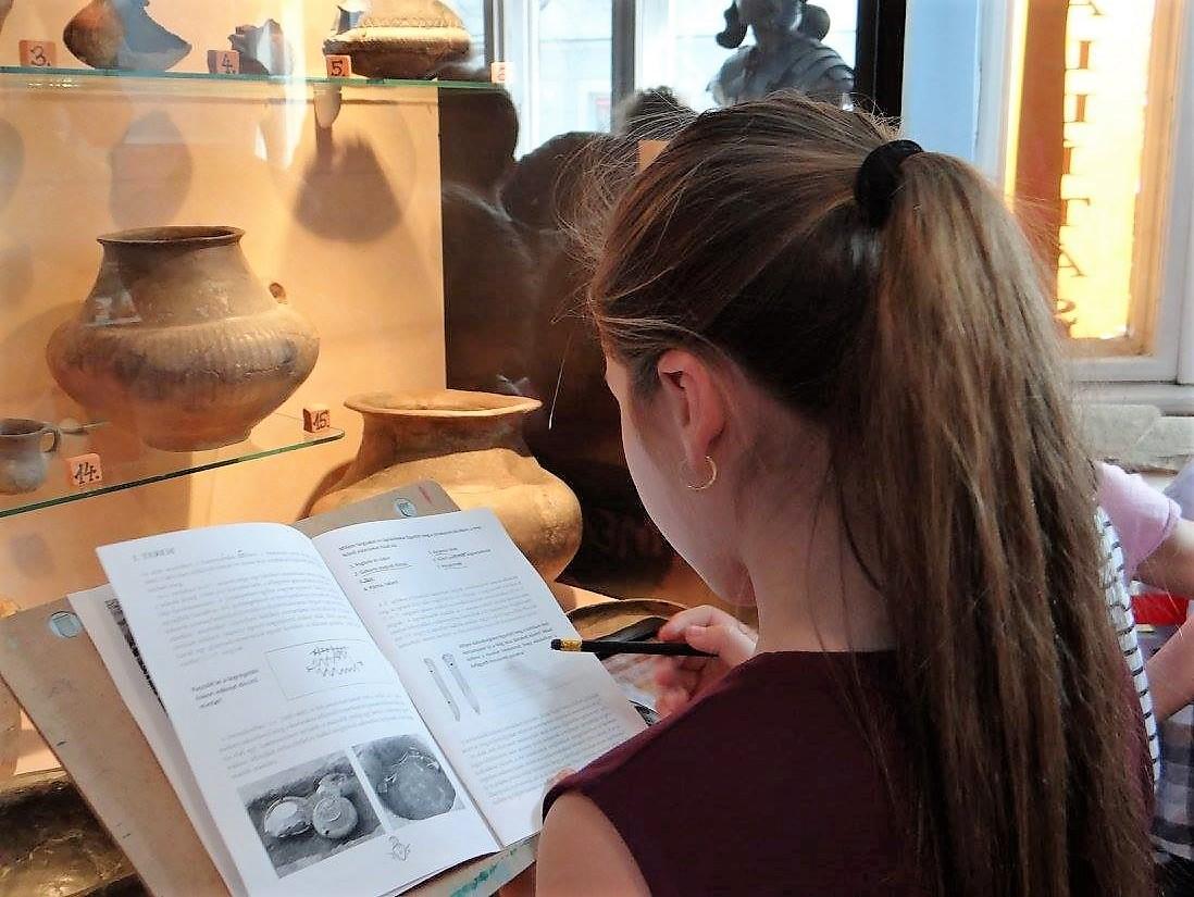 For the paper-based interpretation, a playful museum guide workbook was created which leads the children through the exhibition. The guide tells the brief history of the era and presents the archaeological findings and their use in form of quests, written activities, tasks et cetera. The workbook was directly designed for children combining various learning methods such as formal and informal learning. The tasks were designed according to constructionism and situated cognition learning processes (See Fig. 1).