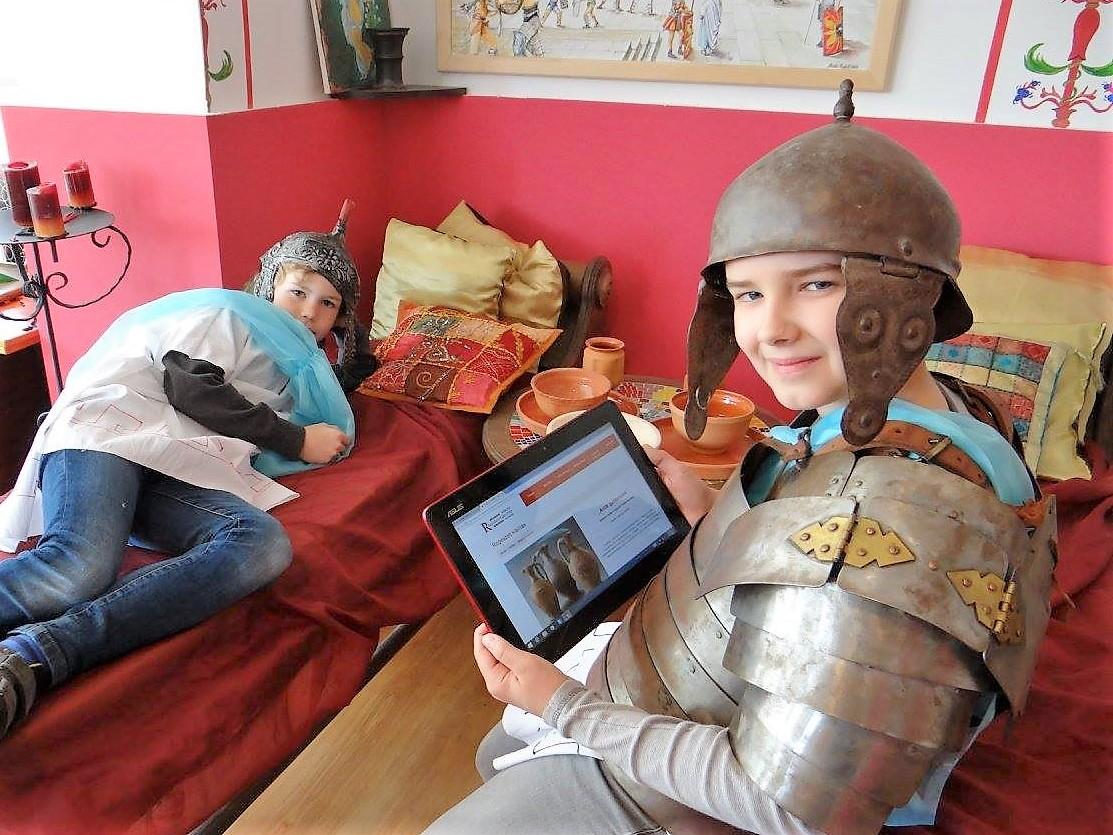 Live interpretation combines a wide range of informal educational methods with theatrical and experiential learning elements. The program called âLive History classâ, where the students under the lead of the reenactor, travel back in time to experience and understand the life of ancients. The lecture starts with an introduction game, which facilitates immersion within the historical era and place. The children dress up like Romans and with the facilitator, they play a sacrificial ritual for Goddess Flora. After the ceremony, the time travel continues in the exhibition, where the showcases presented by the reenactor with games, stories and the tactile exhibition. Experiential-learning and its facilitation, was the task of the reenactor to involve the children in activities which help them to experience, understand and re-live the past. Such exercises were to participate in a Roman supper and gladiator game, using the authentic objects and enliven the exhibited artefacts. Besides, to gain a wider knowledge about the geography and history of the Roman Empire, large board games, wooden-puzzles helped the students âtouch and understandâ the ancient world (See Fig. 3).
