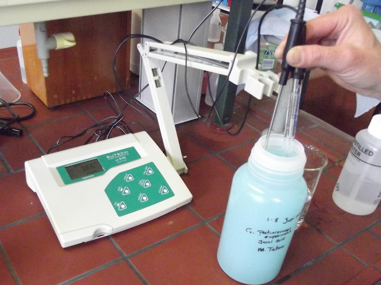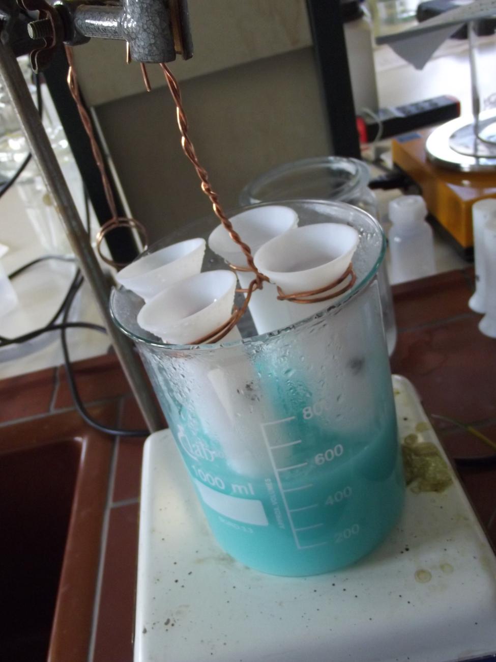 For the patination in solutions 8 teflon containers were perforated, of which 4 fitted in a pyrex glass of 800 ml (ca 27 oz). The pH level was measured several times at different temperatures, usually first at room temperature and then at the proposed temperature for the patination solution (See Fig. 28).