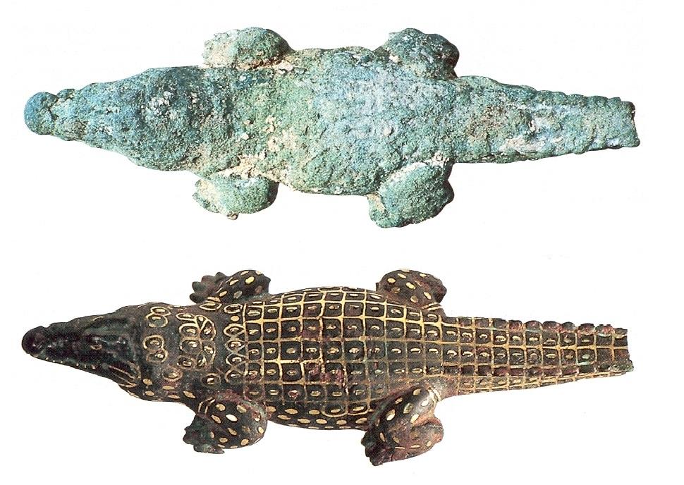 Currently, the earliest applications of dark patinated copper alloys are found in ritual statuary and weaponry from the 19th century BC in Egypt (the El-Fayum crocodile, Fig. 1) and Palestine (the Khopesh sword of Balata-Sichem, Fig. 2) where they formed the main base material with inlays of electrum. Electrum is a naturally occurring gold alloy with 20-25% of silver.