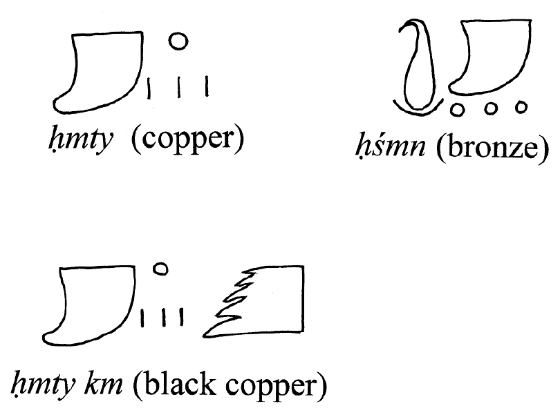 According to some researchers, the Egyptian hieroglyph hm-ty km is associated with black copper whereas the word hsmn-km is associated with black bronze (See Fig. 12) (Cooney, 1966, p.43; Giumlia-Mair, 2012b, p.5). This is a possibility, but even more difficult to establish than the Roman period alloy corinthium aes for which there are contemporary descriptions.