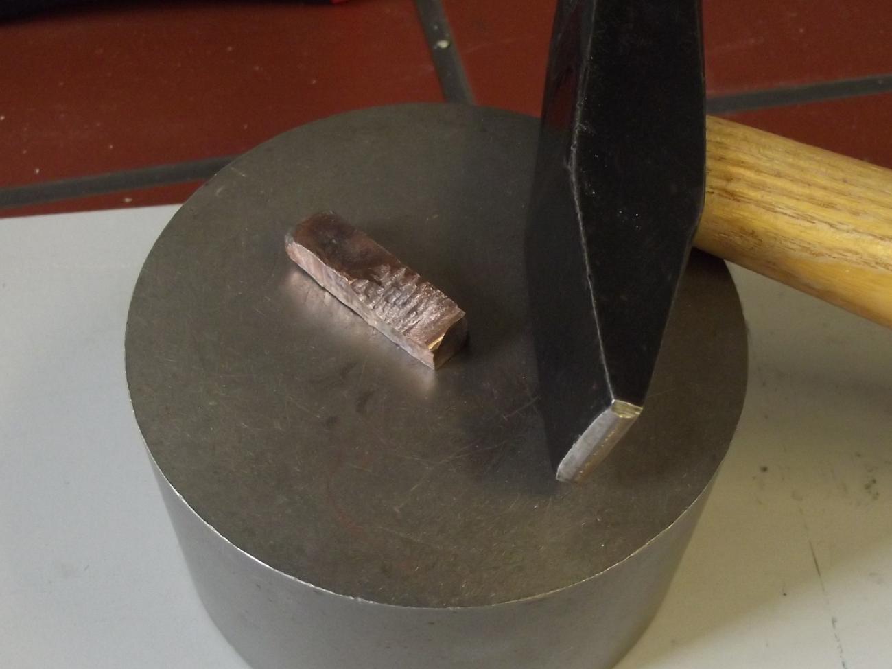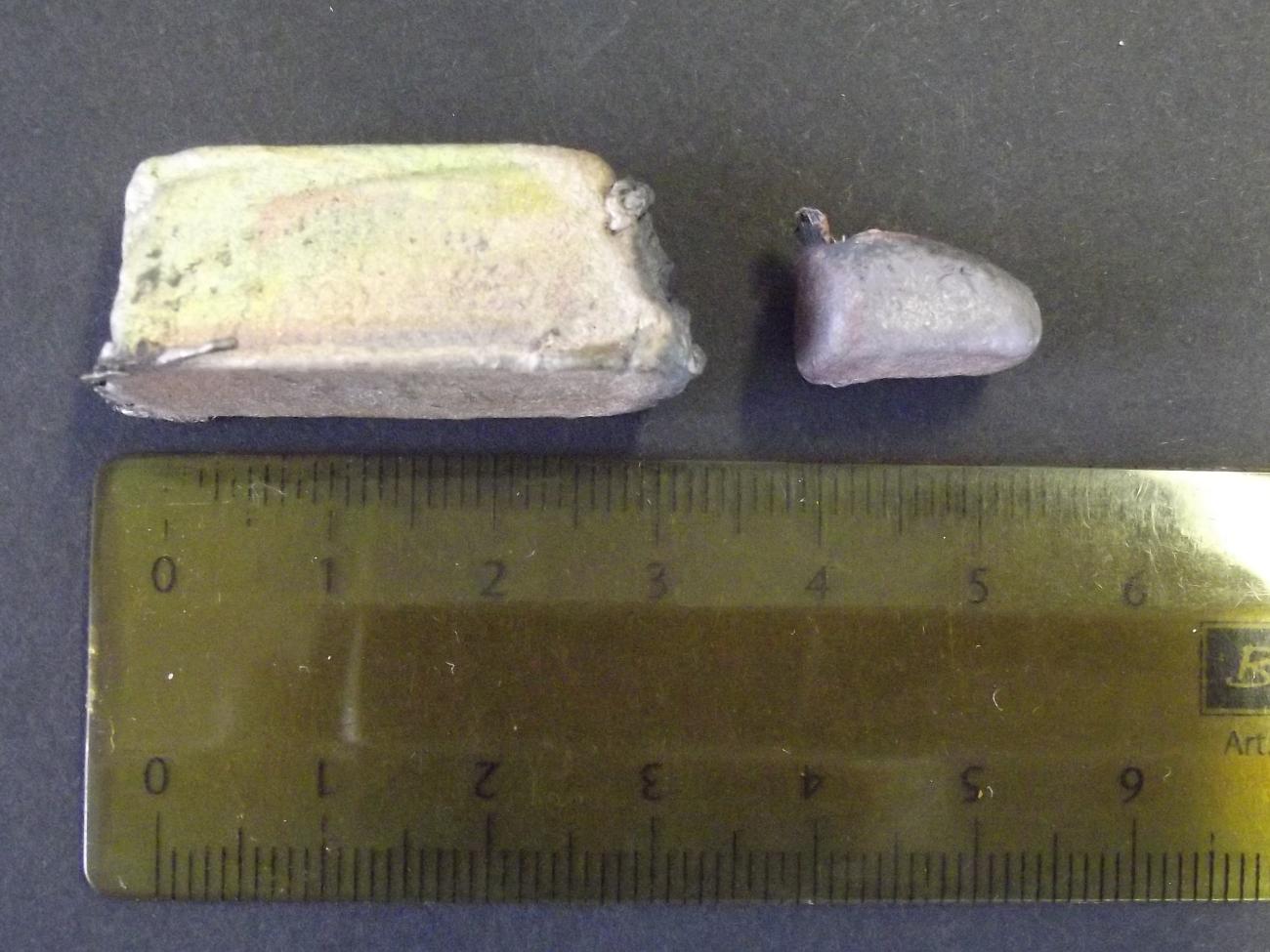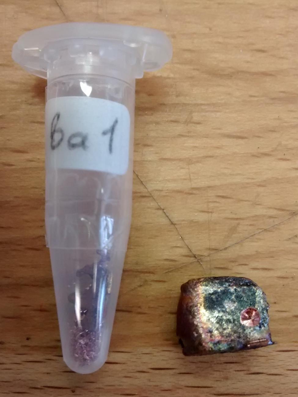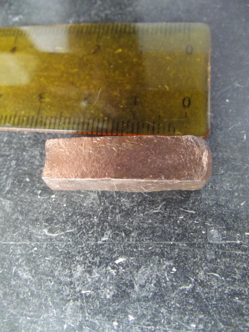 The samples proved rather hard to cut, as if they had a high density. Perhaps also due to the size of the ingots, but comparatively the samples that were only cast were almost as tough as compared to those that had been forged, regardless of the variation in annealing. Some of the alloys had a relative good ductility (alloy 1, alloy 5, alloy 8) while the others were less workable. One also turned out to be hollow inside (alloy 2), so the ductility of this alloy could not be adequately tested. Alloy 5 is the arsenic free copy which had a relatively good ductility, conforming to the description by Giumlia-Mair and Lehr (2003, p.297).