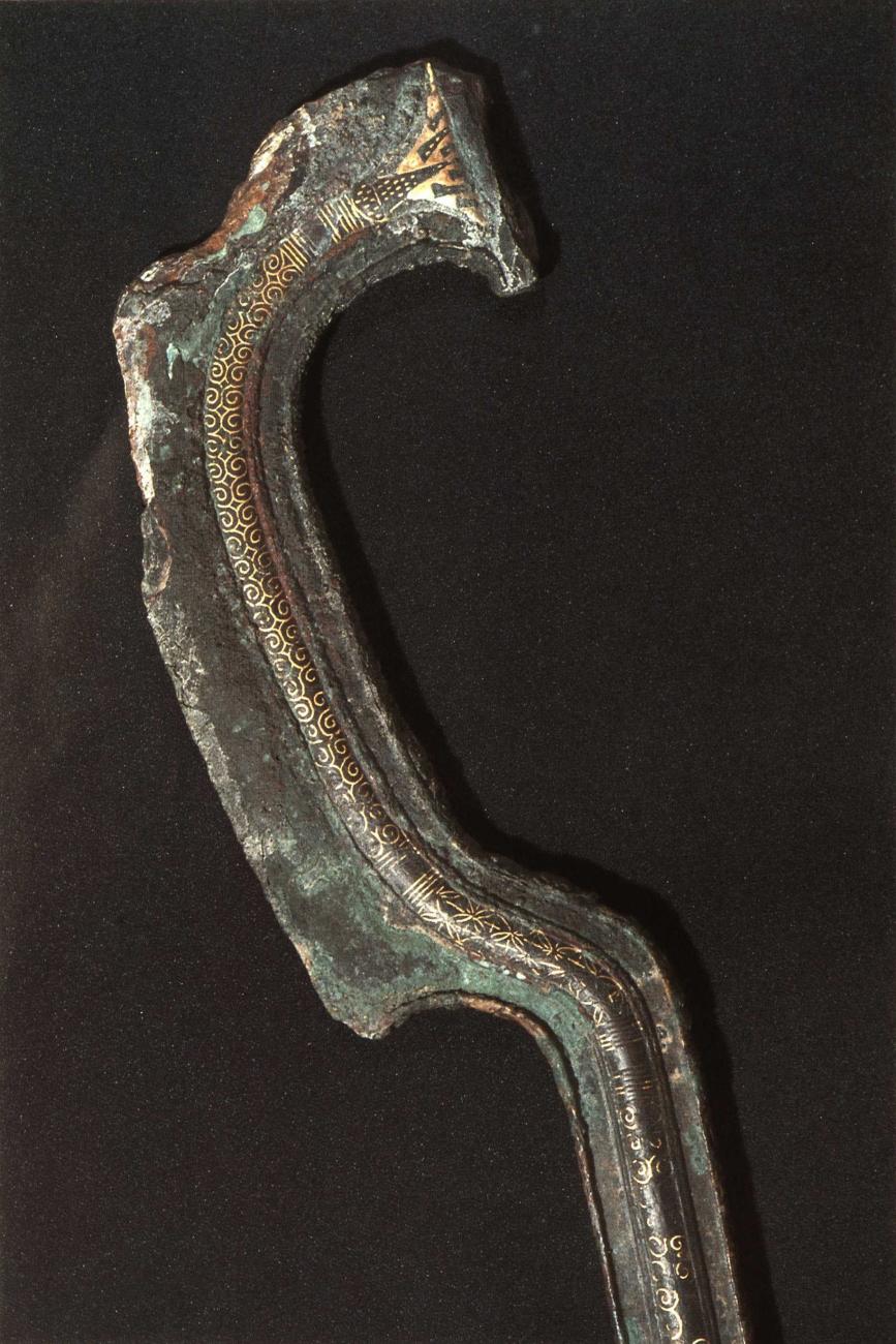 Within the bronze base of the sword is an inlay of dark patinated bronze that is decorated with electrum in elegant floral swirling patterns ending in a lotus (alloy 1 and 4, Fig. 2). A striking feature is the purity of the bronze and the polymetallic copper alloy used for the inlay of the dark patinated midrib indicating deliberate production choices (Giumlia-Mair and Riederer, 1998).