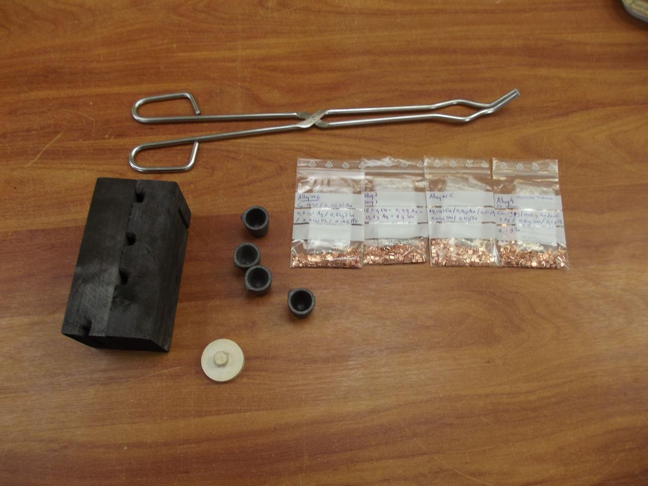 The casting forms were carved from natural charcoal soldering blocks that ensured a reductive atmosphere with good heat properties. The pure copper, fine gold, fine silver and other pure elements (save for antinomy) were acquired from a goldsmithâs wholesaler, the Aachener Foundry and the faculty of Material Engineering of the Ruhr University in Bochum (Germany).