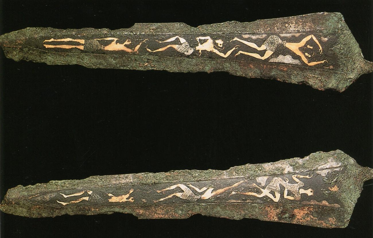 The third is a Mycenaean dagger in a private collection, with a midrib of a dark patinated copper alloy that bears additional inlays of electrum and gold in an elegant motif of dancing figures (See Fig. 3). Analysis of the dark patinated copper inlay in the midrib was the basis for alloy 7 (Ogden, 1993, p.42; Giumlia-Mair, 2013, p.100).