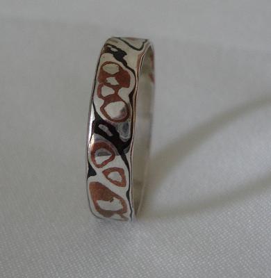 The author created a binary shakudo alloy (96% electrolytic copper, 4% gold) to be used as an alloy in a mokume gane plate during her goldsmithing studies in 2005 under the supervision of master goldsmith Louis Hankart (See Fig. 32). The shakudo patinated deep black after wearing the ring containing it for several days (due to natural chlorides and acids of the hands).1