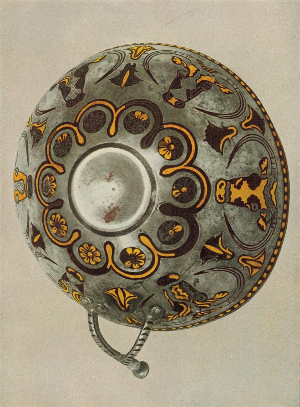 The pattern (of bullâs heads, lotus flowers, âgarlandsâ and rosettes) at least visually appears fairly symmetrical, which is not easily achieved on a convex shape. Finally, a handle was attached through riveting to the cup.