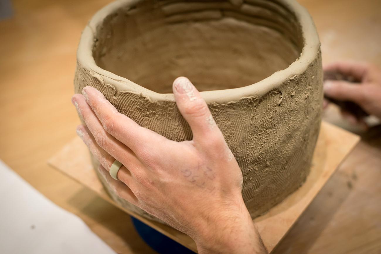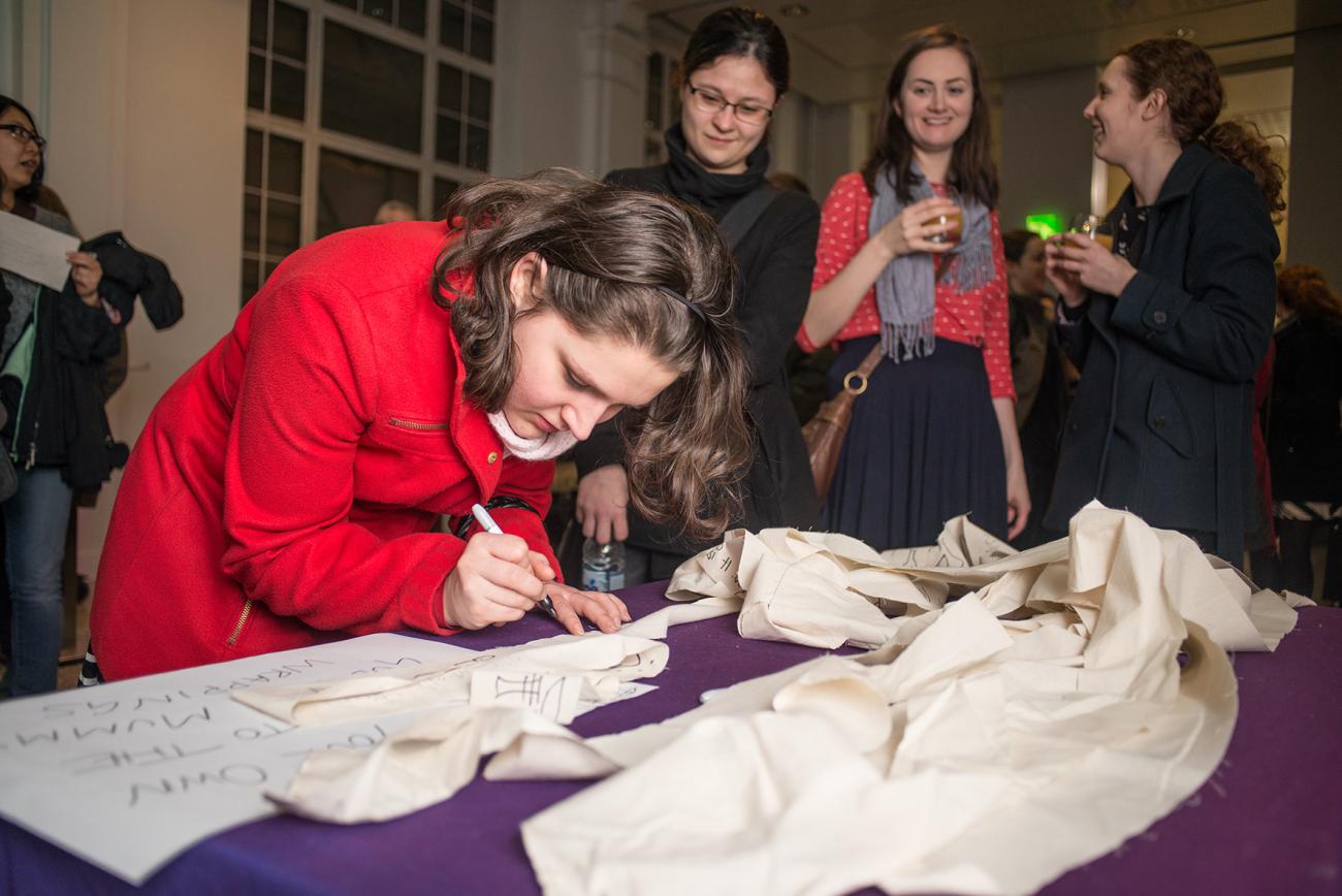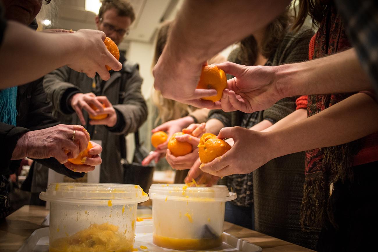 To add to the atmosphere of the occasion and to encourage visitors to engage with the wider themes of the exhibition, a range of activities ran throughout the evening. Visitors could attempt mummification of oranges (See Fig. 11) before going upstairs to see ancient human mummies on display in the Egyptian ‘Ancient Worlds’ gallery. A local textile artist used screen-printing techniques to copy short Egypt-inspired poems onto linen fragments (See Fig. 12). These fragments were offered to visitors echoing the strips of mummy linen given as souvenirs to guests at Victorian un-rolling parties. A ceramicist recreated a coiled pot similar to those used to hold ibis mummies at Saqqara (See Fig. 13). An interactive theatre company re-enacted Liverpool’s dockside auctions of 1890 which added to the dynamic atmosphere in the exhibition space itself and reinforced the underlying concept of mummy destruction.