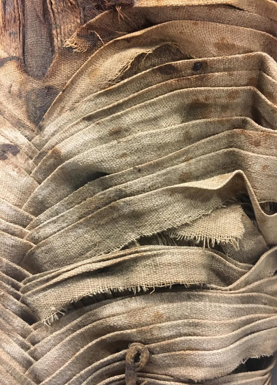 The fabric strips were prepared in advance of the event. The different fabrics and wrapping stages were developed based upon those witnessed during the radiographic investigation and visual assessment of ancient mummies. Cotton calico and hessian were used as substitutes for linen in this experiment; however, the qualities of the fabrics were chosen for their similarity to ancient linens. Fabric rolls were used to pad the plastizote form as identified in the ancient mummies (See Fig. 6). A summary of the various stages of wrapping is presented in Table 1.