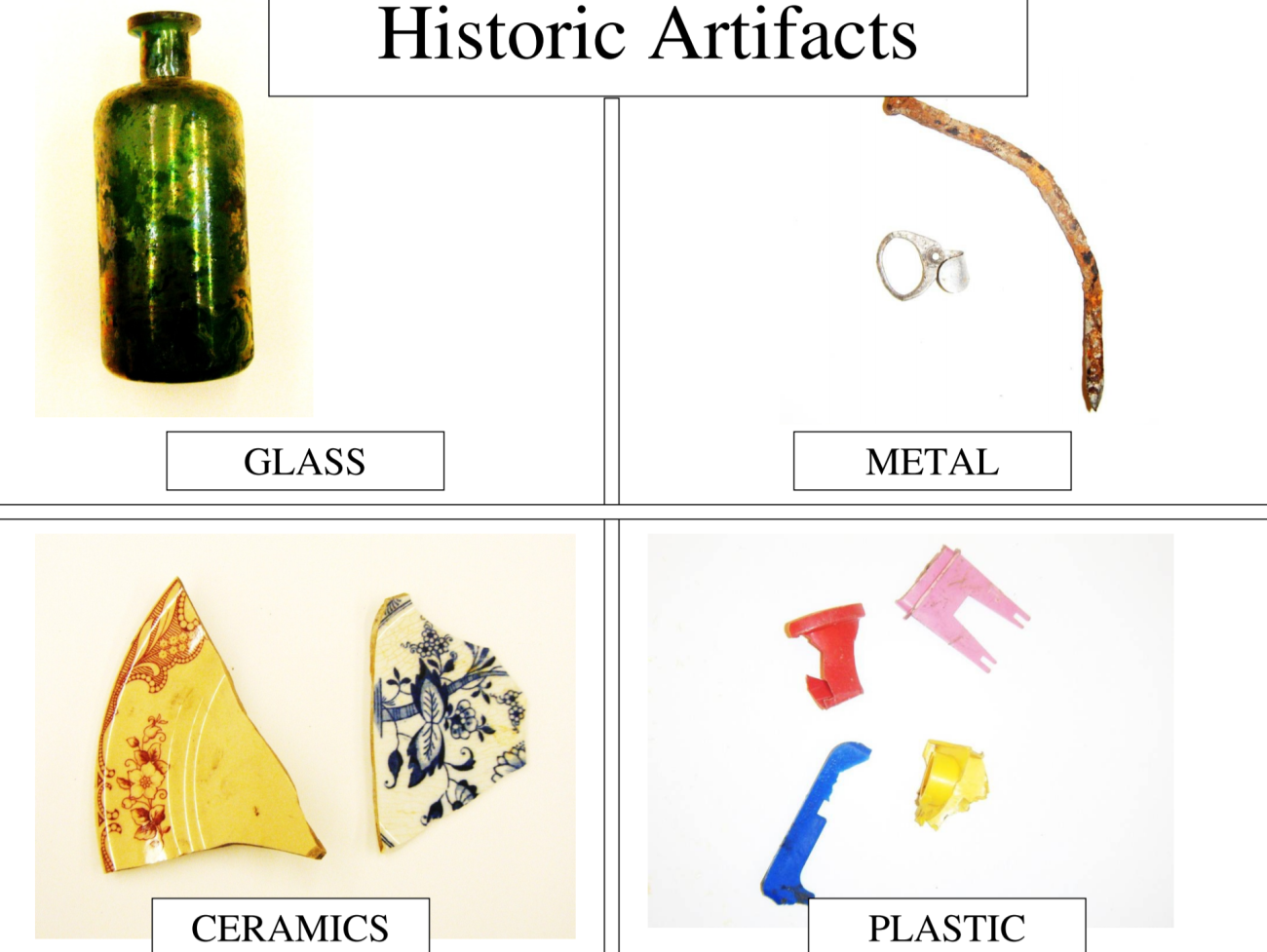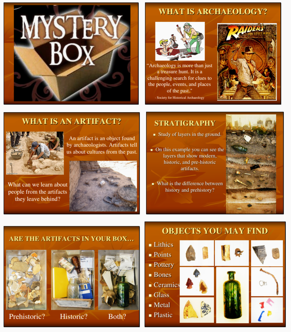 One such program is the âMystery Boxâ educational offering; the program offered visitors or students the opportunity to âexcavateâ various materials. Upon arrival at the museum, visitors are divided into small groups to analyse their assigned box of artifacts. Museum staff present a brief program on the nature of historic and prehistoric artifacts, how archaeologists conduct their work, the role of the museum in the system of processing artefacts, and the relevance of this exercise to the visitorsâ own lives. Participants then sort through genuine, unprovenanced artifacts, such as lithics, nails, coins, glass bottles, and more from the museumâs educational collection. Then, the participant assesses the objectsâ purpose, age, and value to the historical and pre-historical narratives. A discussion of historical versus pre-historical, as defined in relation to the pre-Colonial territory that is today the United States, is also included. The tactile connection with the past stimulates the learnerâs need to touch the past and explore the purpose of various everyday objects, while contemplating what future historians or archaeologists would say about the items they leave behind.