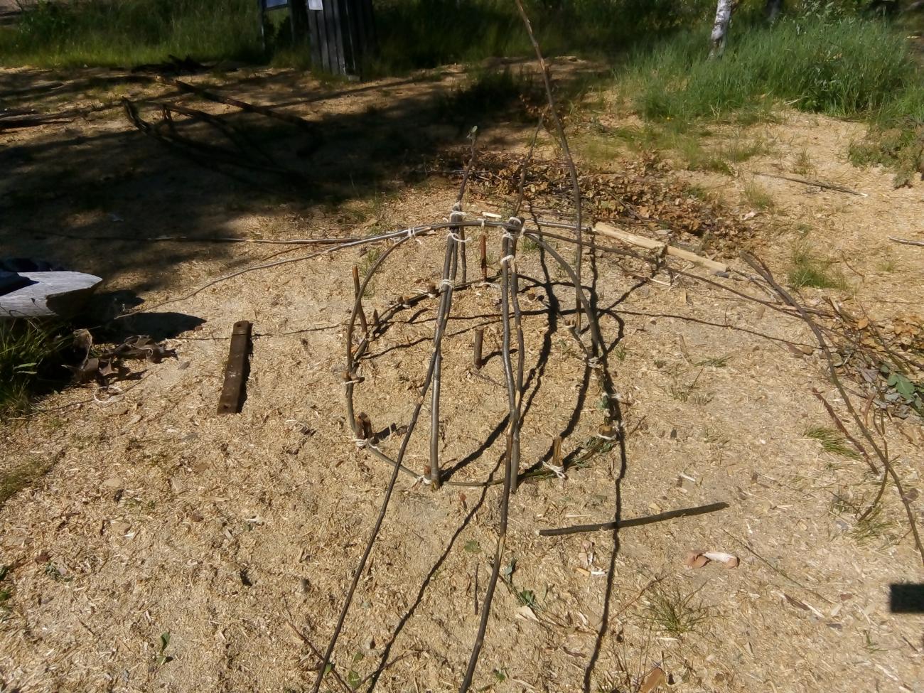 To begin with, an unworked elk skin was laid on the ground. Two of the long alder rods were placed on this and were shaped and tied into an oval, taking care to gauge the potential size of the coracle frame, accounting for the curves and bottom. The alder hoop was then laid on the ground in the work area, ensuring that one end of the oval had a flatter profile. This would be the fore end (front). Using the ground as a clamp, the butts of 14 alder rods were pushed into the ground at regular intervals around the edge of the hoop. The butts were tied to short pegs to prevent the rods from moving in the soft soil during the later weaving process, which would place tension on the frame. These alder rods were then bent over and tied to create the ribs (hoops) of an upside down ‘basket’ (See Figure 1).