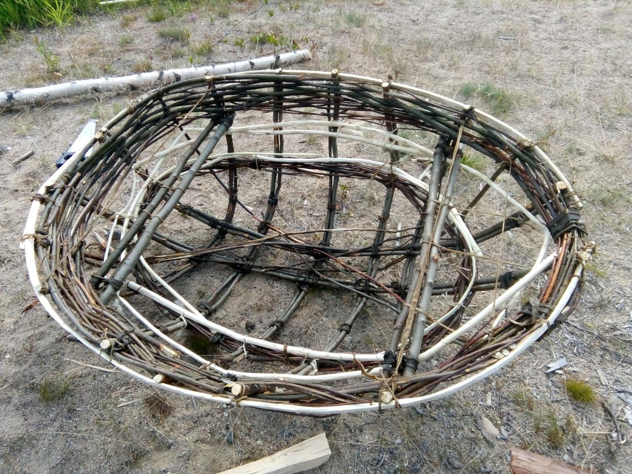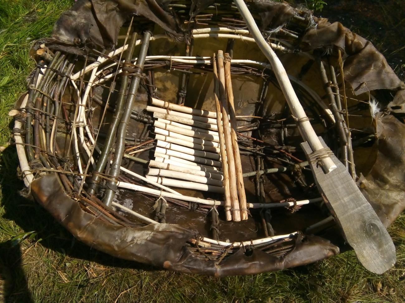 The plant materials used throughout construction reflect those of the area, alder (Alnus sp.) and willow (Salix sp.). The skin for the coracle was from an elk (Alces alces) and elk rawhide was used for making the lashings. Steel hand-knives, a steel awl, and a pruning saw were also used.