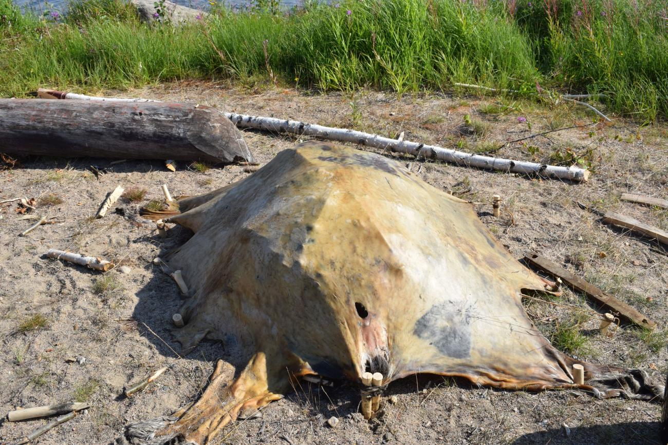Throughout the time that the coracle frame was being constructed, an elk skin had been soaking in the shallow water of the lake margin to soften the membrane and loosen the hairs. Warm water temperatures meant that the skin was ready for working after five days, the flesh, membrane and hair were removed fairly easily (See Figure 4).
