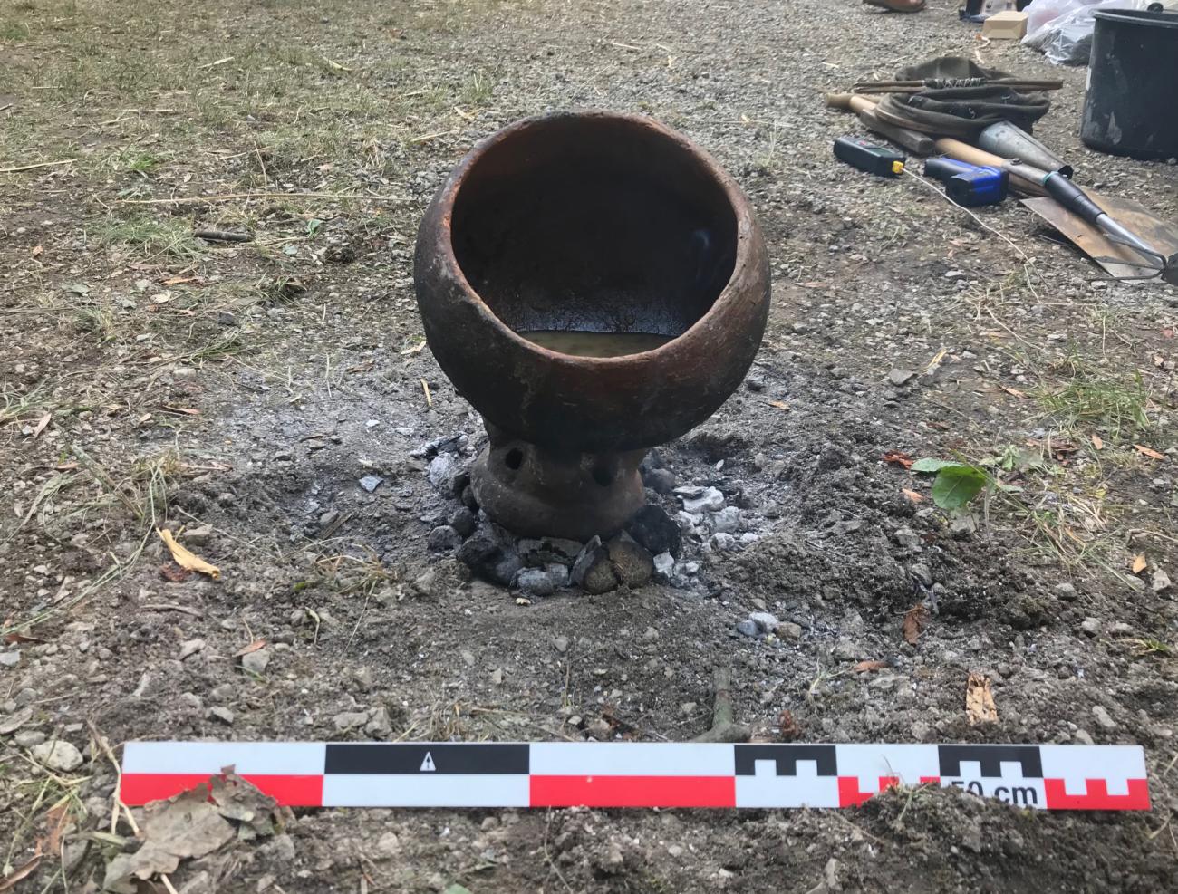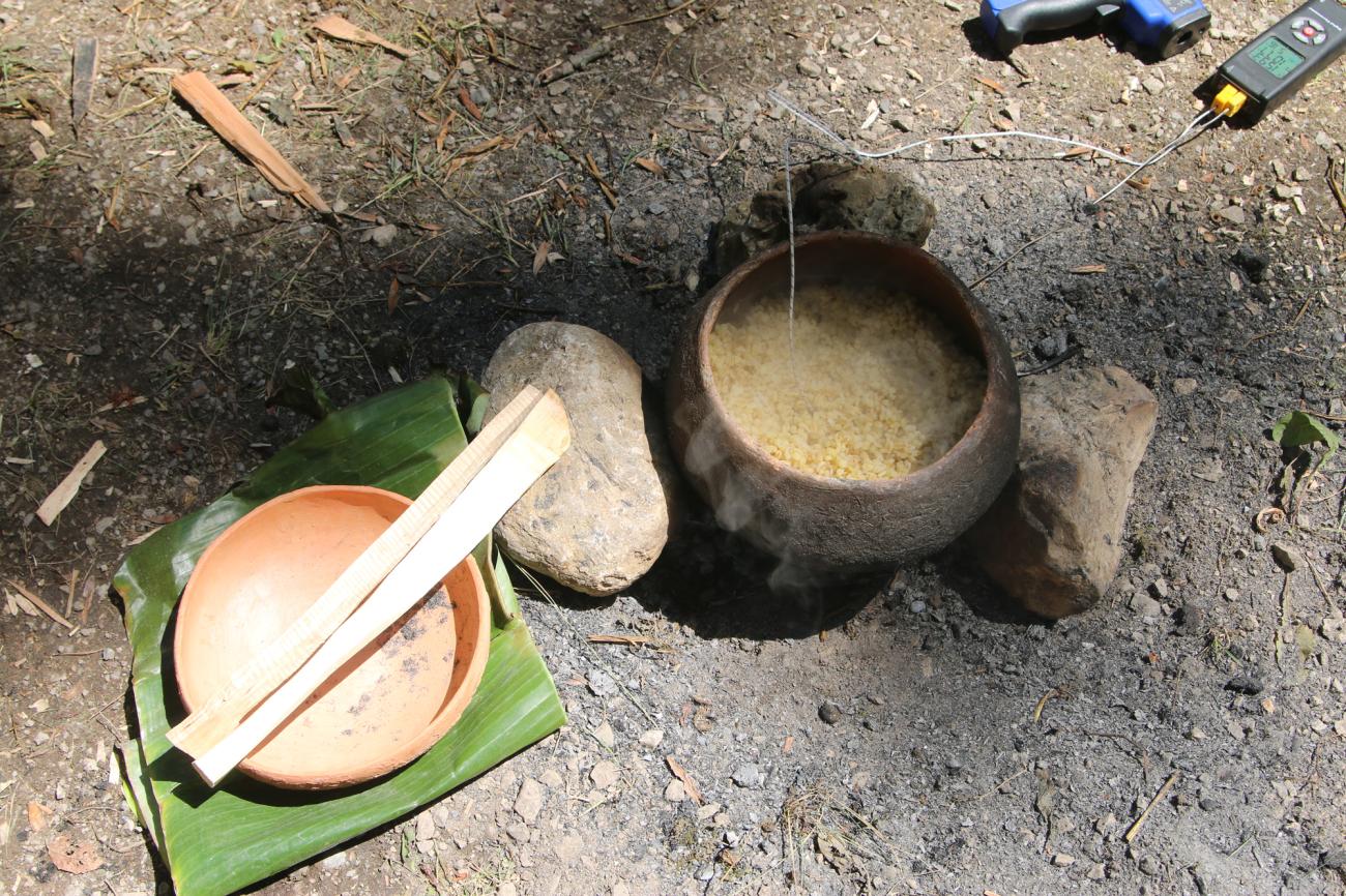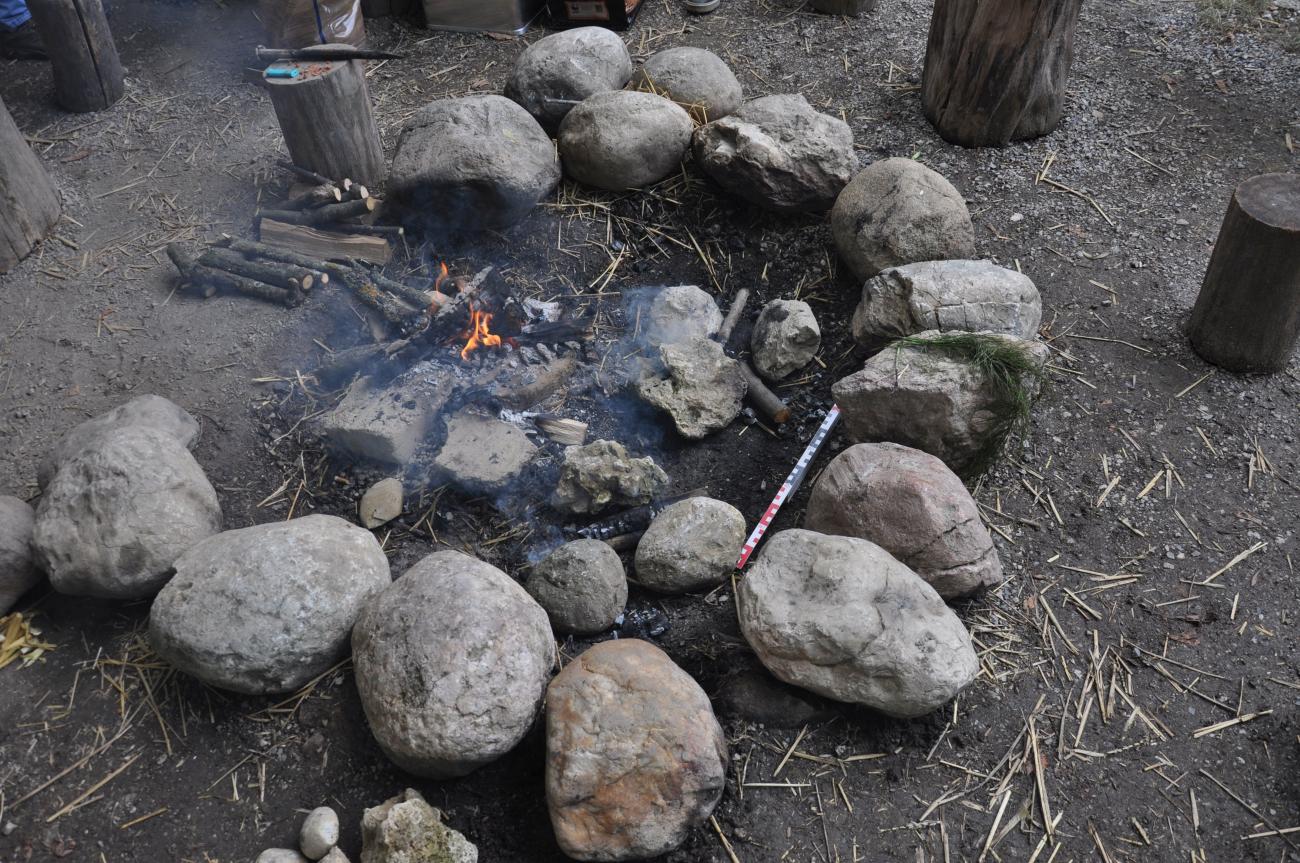 The experiments described in the following were conducted by the authors on 29 and 30 June 2018 in Asparn/Zaya, Austria at the MAMUZ Museum in its open-air park. Simple fireplaces were set up using three stones to hold the cooking pot (See Figure 2); the distance of the potâs base from the ground ranged between 8 to 10cm. Temperature measurements of the cooking pot were taken using a Colemeter WT700 Infrared Thermometer and a digital Type K Thermocouple. Material surfaces as pots were measured by infrared; fire and pot filling temperatures were taken by the Thermocouple. Larger and sudden variations in the fire temperature (See Tables 1-9) may origin in inaccurate measurements as it is nearly impossible to position the probe two times in exactly the same way, and the fire itself shifts as material is consumed. Differences can also occur when the probe is held in the embers or in the flames. All temperatures as given in the tables are in °C.