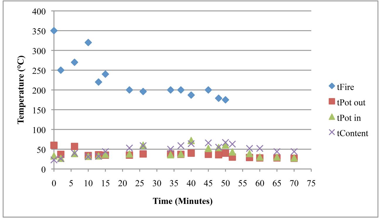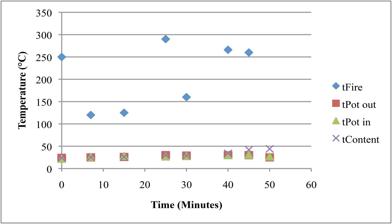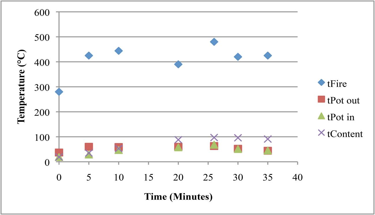 | Sheep / goat dung | The experiments using ovicaprid dung reached lower temperatures but stored the heat for a relatively long time. Two trials were undertaken (See Tables 8 and 9). In the first one, the temperature of the fire changed a lot, while the temperature of the content slowly and constantly increased (See Table 8). These changes in the temperature are presumably connected with the different properties of goat versus sheep dung and resulting problems in keeping a steady temperature. In the second experiment a fire dog was used to hold the cooking pot and the fire temperature was continuously around 300°C, providing stable conditions for the Nubian cooking pot and its contents (See Table 9). Quantity of dung used: 300g / 100g Highest temperature reached: 290° / 320°C |