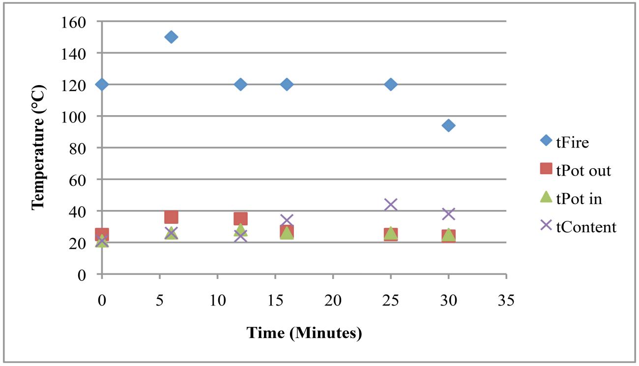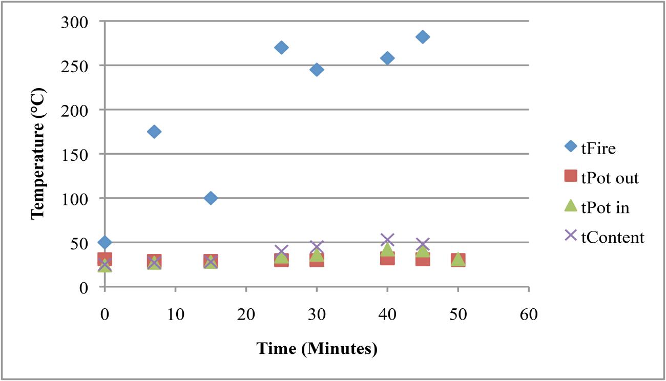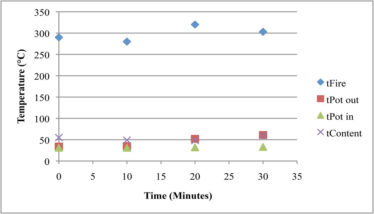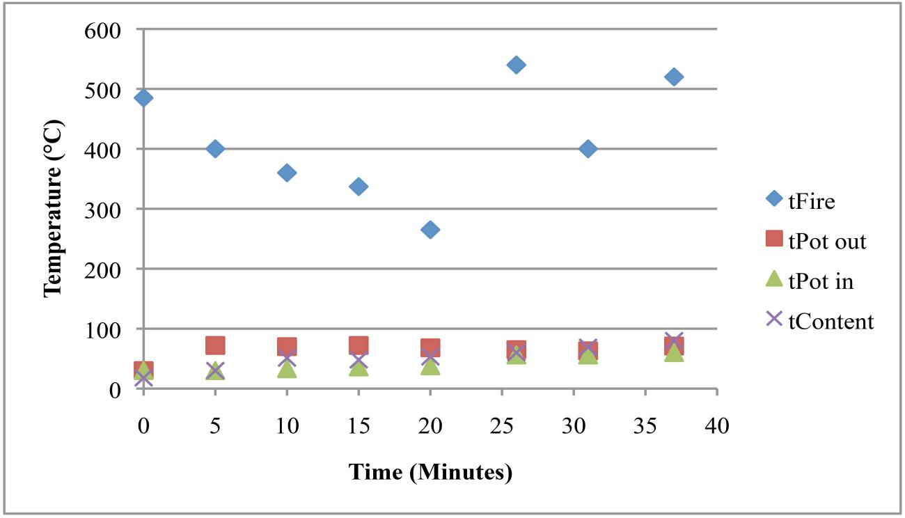 | Sheep / goat dung | The experiments using ovicaprid dung reached lower temperatures but stored the heat for a relatively long time. Two trials were undertaken (See Tables 8 and 9). In the first one, the temperature of the fire changed a lot, while the temperature of the content slowly and constantly increased (See Table 8). These changes in the temperature are presumably connected with the different properties of goat versus sheep dung and resulting problems in keeping a steady temperature. In the second experiment a fire dog was used to hold the cooking pot and the fire temperature was continuously around 300°C, providing stable conditions for the Nubian cooking pot and its contents (See Table 9). Quantity of dung used: 300g / 100g Highest temperature reached: 290° / 320°C |