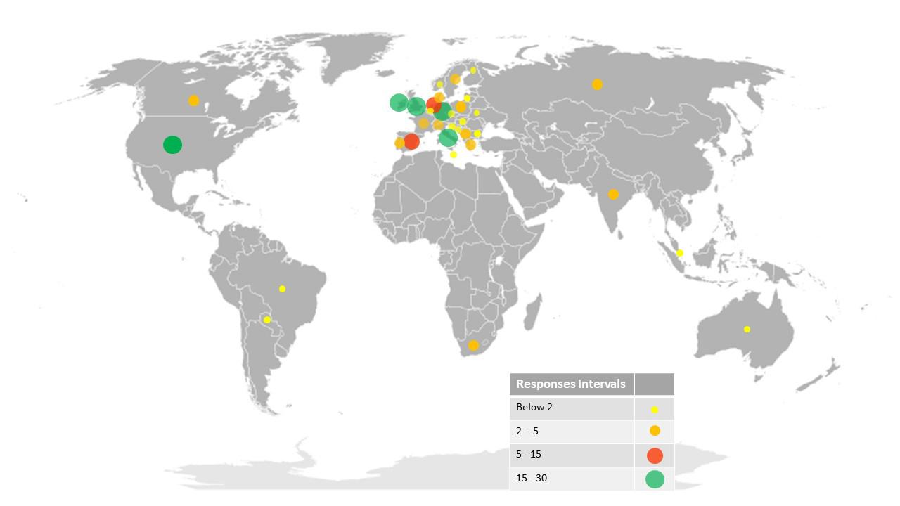 The survey was aimed in gathering responses primarily from the European area, but data were collected also from other countries. As it can be seen from the geographical distribution of responses (See Figure 1), only few countries returned more than 15 replies, and others only very few. This uneven distribution is illustrating not the lack of the realities under scrutiny but merely a scarce reaction to the questionnaire.