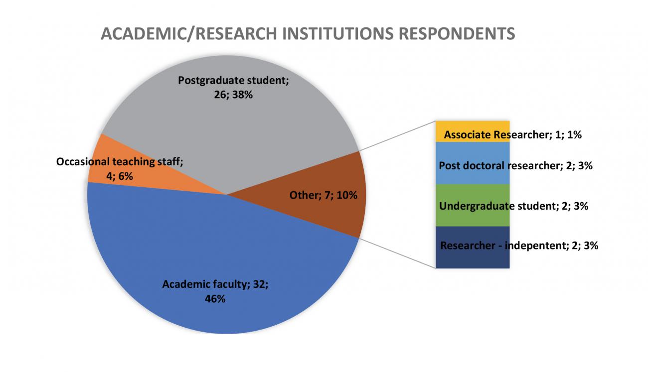 The respondents belonging to academic or research institutions (See Figure 4) were mainly academic faculty members and postgraduate students (PhDs included). A relatively small fraction of this category was represented by occasional teaching staff, associate researchers, post-doctoral researchers, independent researchers, and undergraduate students.