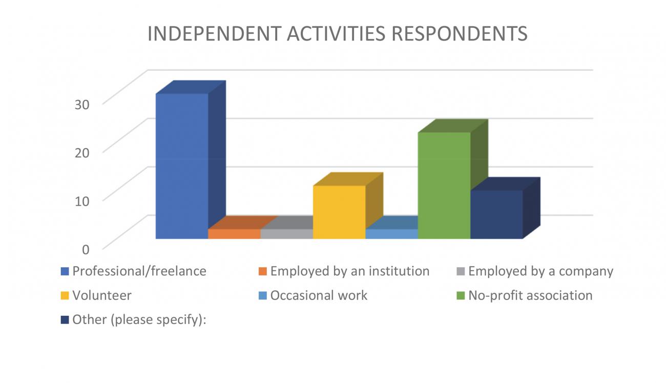 A relevant number of respondents declared to be freelance professionals, followed by non-profit associations, and volunteers. Only very few declared themselves to be employed by institutions or companies and doing occasional work experiences (fig. 5). Of the open-ended specifications, some of the respondents, in equal numbers, specified that they performed craft activities, or they were independent researchers.