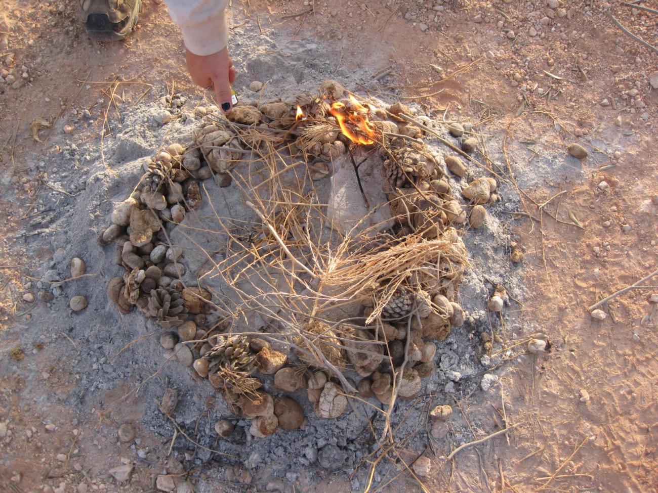 We cleared the hearth area of stones and other material that might interfere with firing. We quickly used up all fire-starters of dried grasses and shrubs in the immediate area and expanded our search into a nearby valley where we gathered pine twigs, needles, and cones.