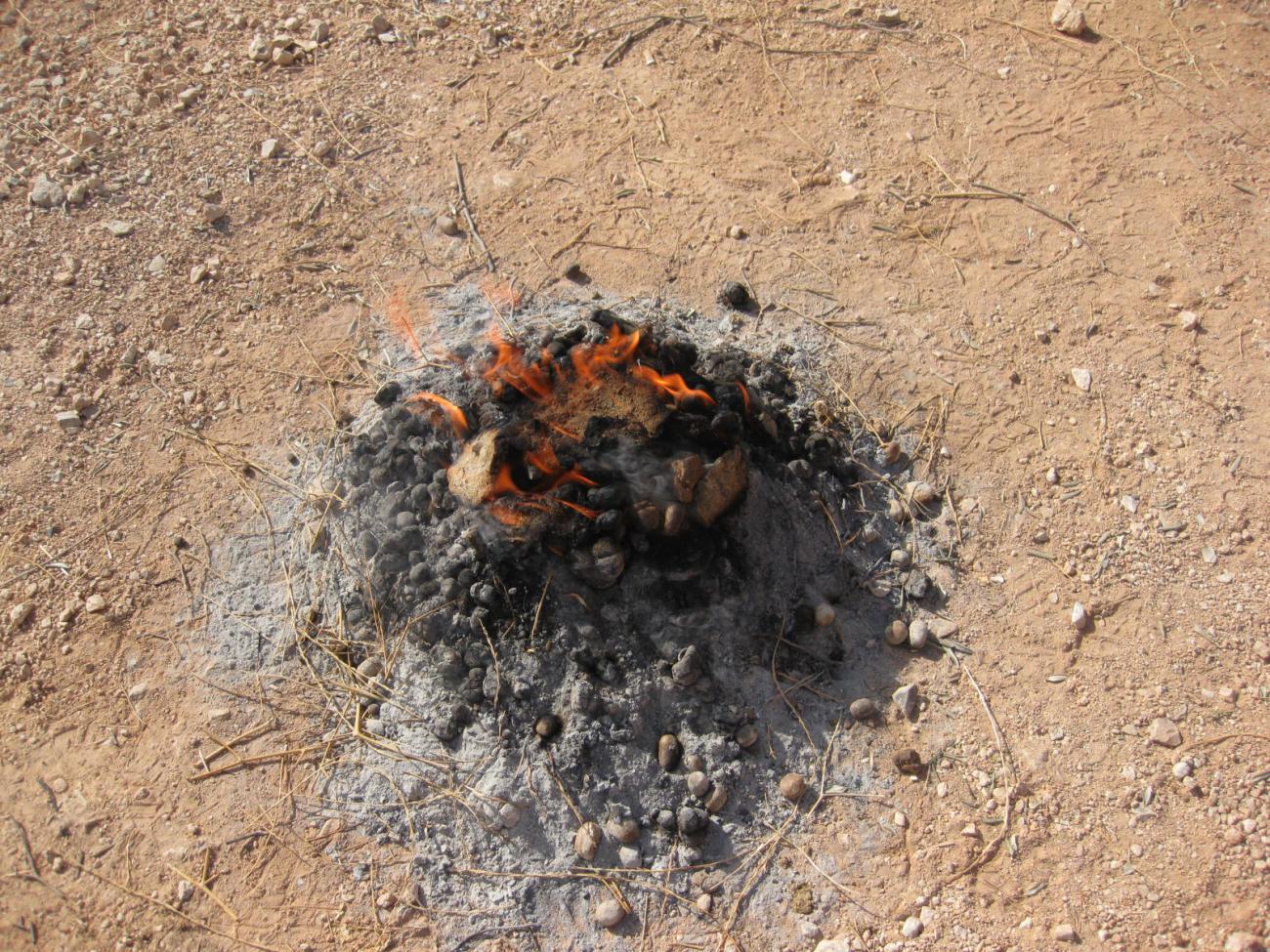 The primary question here is whether camel dung fuel, a previously unstudied waste product for this purpose, can achieve temperatures to harden clay vessels in a bonfiring setting. Once we achieved successful firings with only camel dung fuel we explored the effect of adding small amounts of sheep dung in some firings. This step was included because sheep dung was available as fuel in antiquity and we has an opportunity to discuss details of sheep dung with Bedouin ladies.