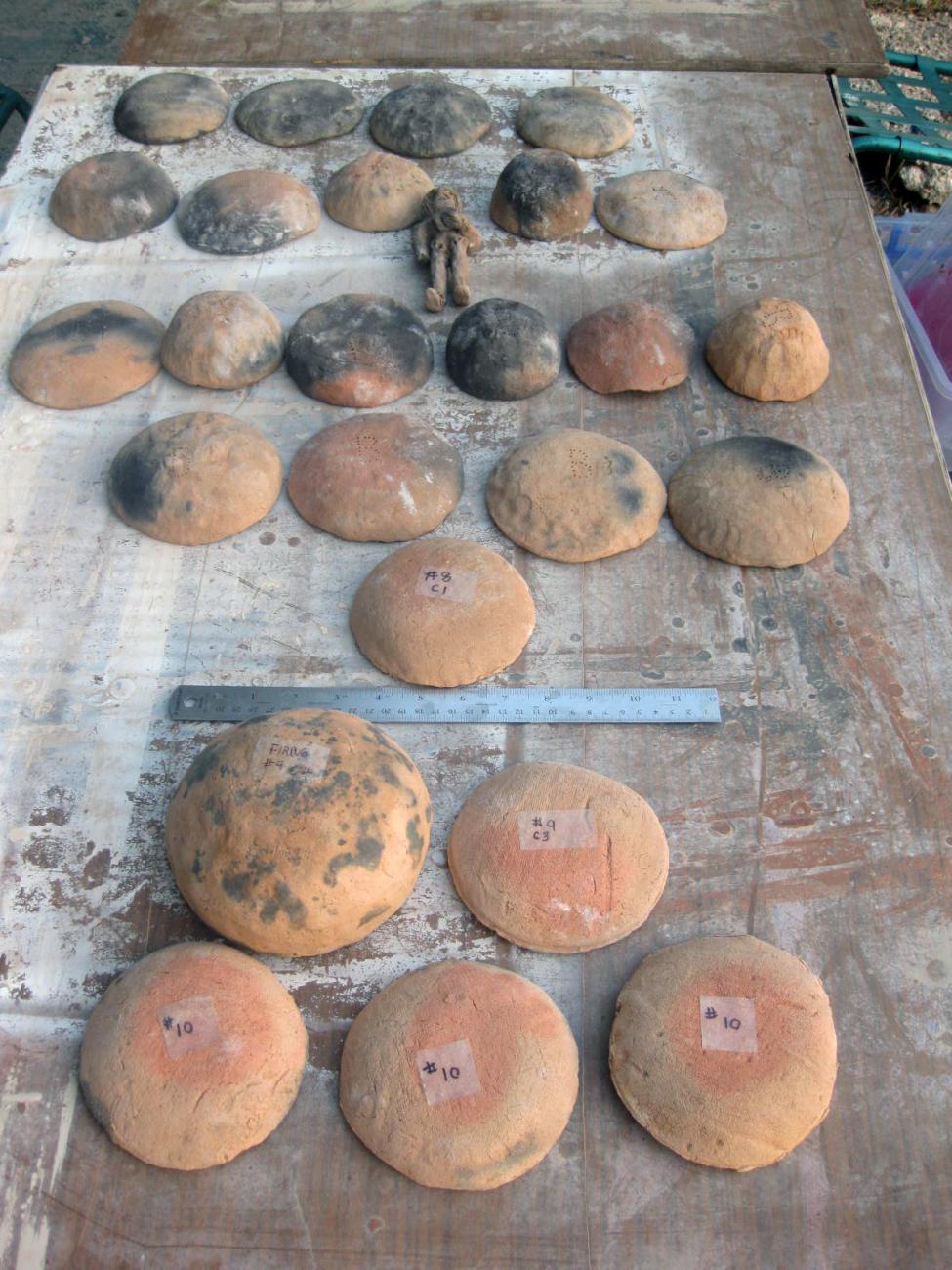 Fresh breaks on twelve vessels presented clear colors throughout the section, an indication of a relatively well oxidized atmosphere (Rice, 1987, Figure 11.3). There were no black cores in any cross section (See Table 1b). After each firing enough ash remained in the hearth to expand the diameter, which nearly doubled by the end of the experiments from 51 cm to 79 cm. This buildup would not have occurred if the ash was removed for fertilizer.
