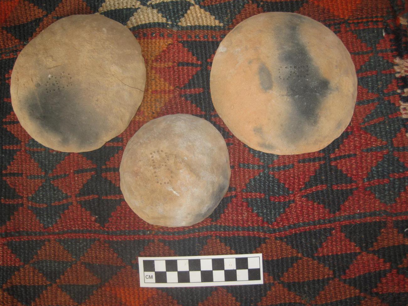 A significant influence on vessel color was placement in the setting, whether mouth up or down, as they came in contact with dung fuel. When dung settled inside a vessel there was a black patch within the vessel caused by a reduced atmosphere. Vessels placed mouth down showed black patches on the outside.