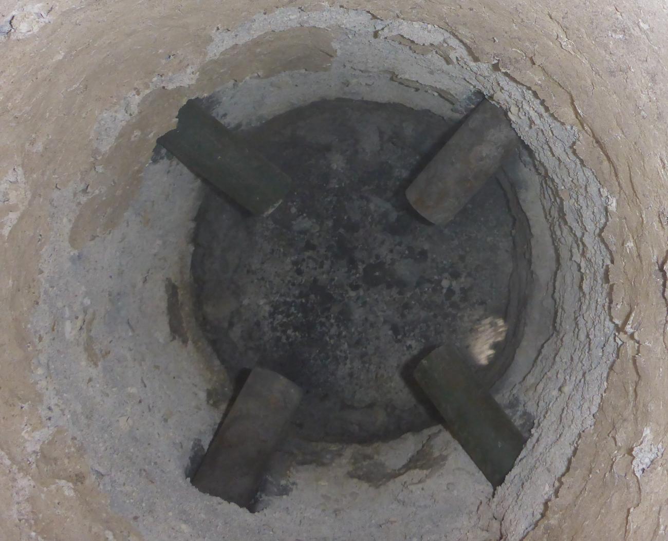 Mounting the inlets right at the furnace base was a mistake. The accumulating ash needs some place to go. Also, as individual charcoal pieces are consumed, they get smaller, reducing the gaps between them that allow air into the system. In retrospect, this should have been obvious based on DARCâs previous smelting work. A shallow pit, extending below the inlet level, would have provided a space for ash to collect into without blocking these air intakes.