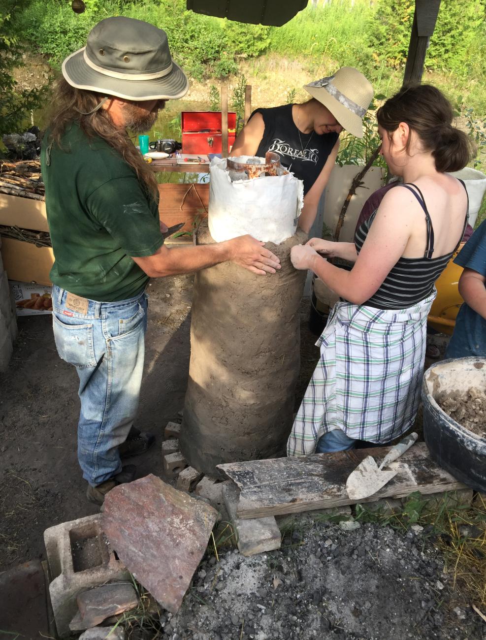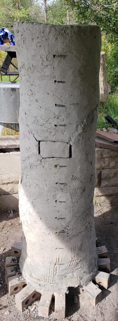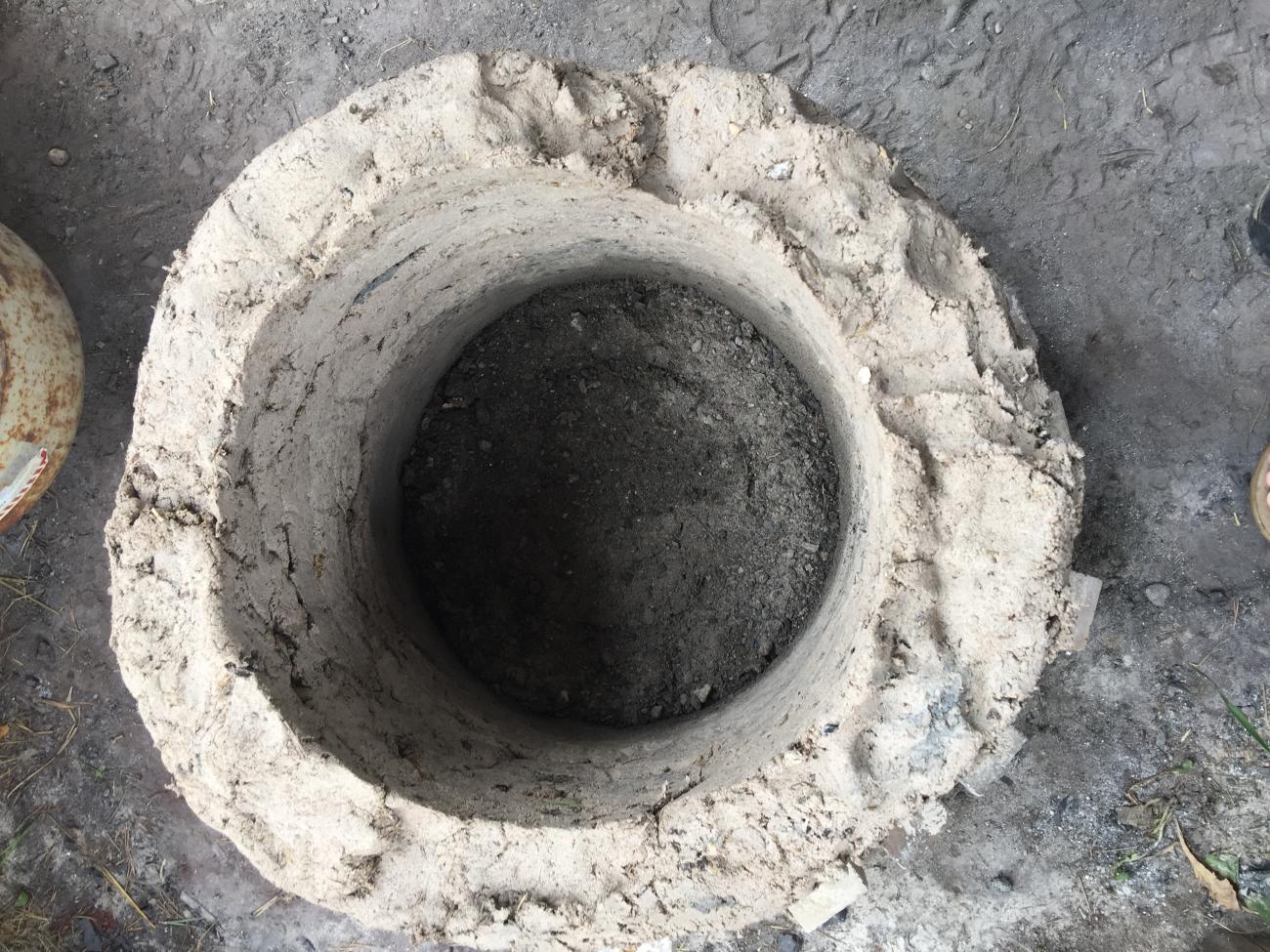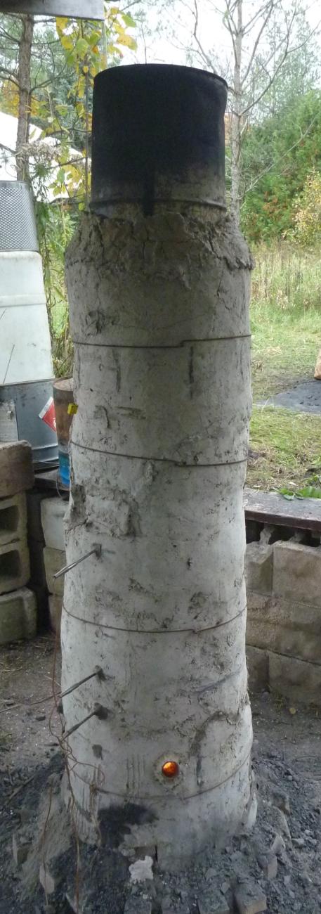 Instead, a clean build from start to finish was initiated. The entire construction was cobb (clay, sand, and horse manure mix in equal volumes). The plan was for a furnace with a 50 cm outside diameter at the base thinning as it got taller, 30 cm internal diameter, and a height of at least 1.4 m. Given that our past bead furnaces have a contained volume of 14 l, while this furnace would result in a contained volume of 131 l, the build was named the Mother Of All Furnaces (MOAF).
