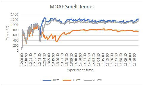 One related observation will affect the planned iron smelting experiment sequence intended for the Fall season. It was originally hoped this âtall stackâ furnace would effectively generate the required 1200°C temperatures through a passive air draw. This temperature range is clearly not available with this specific furnace design. The team felt that it should prove possible to modify the existing structure as defined above to generate the required temperatures (potentially by modifying the air input system).