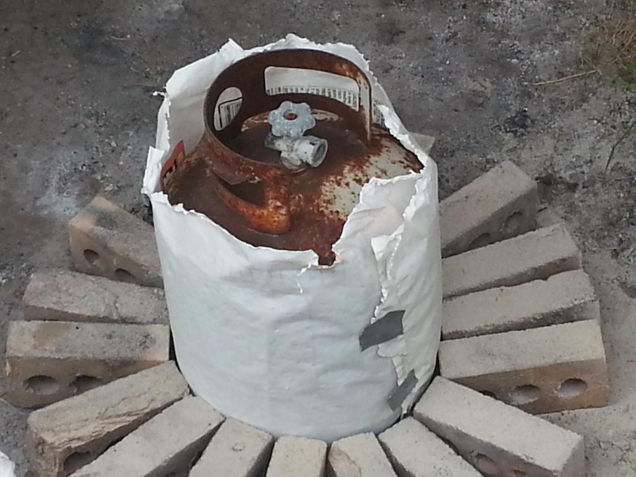 A ring of bricks was placed in a circle with their inner sides forming a 30 cm circle. In this way, the walls could be built on top of the bricks. Individual bricks could be removed later to provide air-ports. Each brick is 6x9 cm in cross section, making each port 54 cm2. The walls were built around a standard 20 lb propane tank to provide a stable 30 cm internal diameter (See Figure 1).