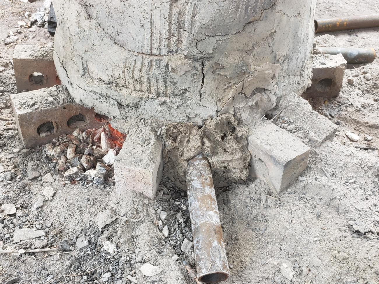The patched crack could easily lead to a "barrel fracture" (Pulling the crack further and further open) due to a couple of different forces - the first force is applied by the clay contracting as heat removes the last traces of moisture, with a second force applied by the expansion of the dry clay as it approaches high sintering temperatures. The pre-existing crack provides a weak area in the structure where these forces can produce a failure. To avoid such a failure, a few wire wraps around the furnace were installed to add additional support (roughly every 20 cm). The working ports and crack were then sealed to maximize the draw through the bottom air-ports.