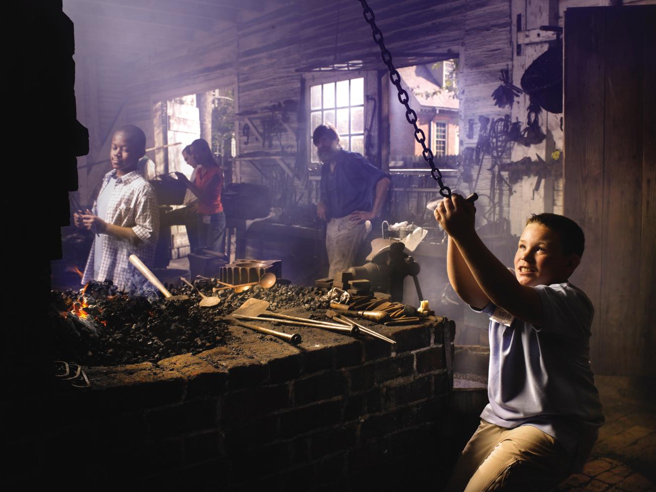 This changed, when in 1928 the Reverend W.A.R. Goodwin encouraged the millionaire philanthropist John D. Rockefeller Jr. to visit one of the important 18th-century buildings of Williamsburg, the Ludwell Paradise House. Goodwin sparked Rockefeller’s interest in the significant role Williamsburg had to play in the American Revolution and managed to get him to support the preservation and purchase of the building. This was to be the first of many such purchases and renovations, that eventually led to eighty-eight houses built in the 18th-century being protected, and ultimately an area of 200 hectares (301 acres) being turned over to heritage preservation–what was the whole of the 18th-century city of Williamsburg. Today, the project survives as Colonial Williamsburg’s Historic Area. Now we are America’s largest open-air living history museum with a total of over 500 structures being restored or reconstructed. Still ‘for the people’ in a multitude of ways, over half a million visitors are welcomed each year by over 400 Colonial Williamsburg staff, with about 150 costumed interpretive staff onsite at any time. We encompass over twenty historic trades, over forty historic sites, and are open 9-5pm daily, 365 days of the year. We have an ongoing philosophy of active reconstruction and preservation of traditional trades and skills that range from metalworkers (founders, gunsmiths, silversmiths, tinsmiths, and blacksmiths), and woodworkers (carpenters, cabinetmakers, joiners, cooper, and wheelwrights) to other fabric workers (tailors, leatherworkers, weavers, wigmakers, shoemakers, and milliners).