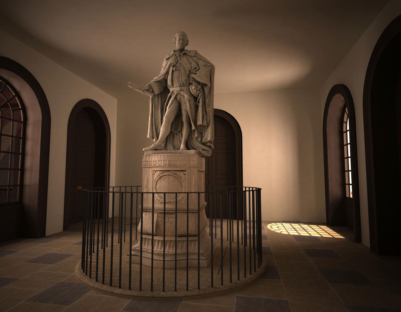 In the physical Williamsburg it was the first Capitol that was reconstructed, based on the larger amount of evidence available for its design and outward physical appearance. The second Capitol had only a few descriptions, none enlightening, and typified by Thomas Jefferson’s indictment that most of the proportions of the building were either too small or too large, with Jefferson including no useful description of the physical form of the building itself (Jefferson, 1787, p.152). Therefore, for the virtual reconstruction we had to go back to first principles using the evidence of archaeological excavation and fragmentary architectural artefacts, subsequently supporting this with contemporary architectural analogy. We do have a single image of the loggia of the second capitol in a state of collapse, a water color by Benjamin Latrobe from 1796 (Latrobe, 1796). The image portrays the logia of the Capitol and is an example of how we can begin to explore phenomenologically the interior space of the building. The original statue of Lord Botetourt is still extant and currently stands in awkward surroundings in the basement of the Swem library at the college of William and Mary, Williamsburg. The statue shows all the evidence of its history and environmental damage. In 1993 the college of William and Mary decided to make a copy of the marble statue using casts from the original, the subsequent reconstruction being returned to a similar likeness to the 18th-century sculpture, although this time cast in bronze. For Virtual Williamsburg we laser scanned the copy, as well as modeled original fragments of pedestal, and base, enabling us to reconstruct the statue. Using the archaeological footprint, in conjunction with the watercolor, we were able to situate the reconstructed statue in its original location in the loggia of Williamsburg’s second Capitol building (See Figure 3). This virtual environment is not only illustrative of the 1776 building but is an immersive, phenomenological, and experimental experience when explored in a fully virtual environment. As you walk through the virtual space of the loggia, you are cognitively–if not physically–walking through another landscape. One could say then, that when we are participating in the non-physical environment of the virtual world, we are at the same time experiencing a purely cognitive, and therefore fundamentally phenomenological, experience. While we cannot recreate an exact replica of the past, we can create an environment where we can begin to experience the past, and a place that can prompt further questions and research.