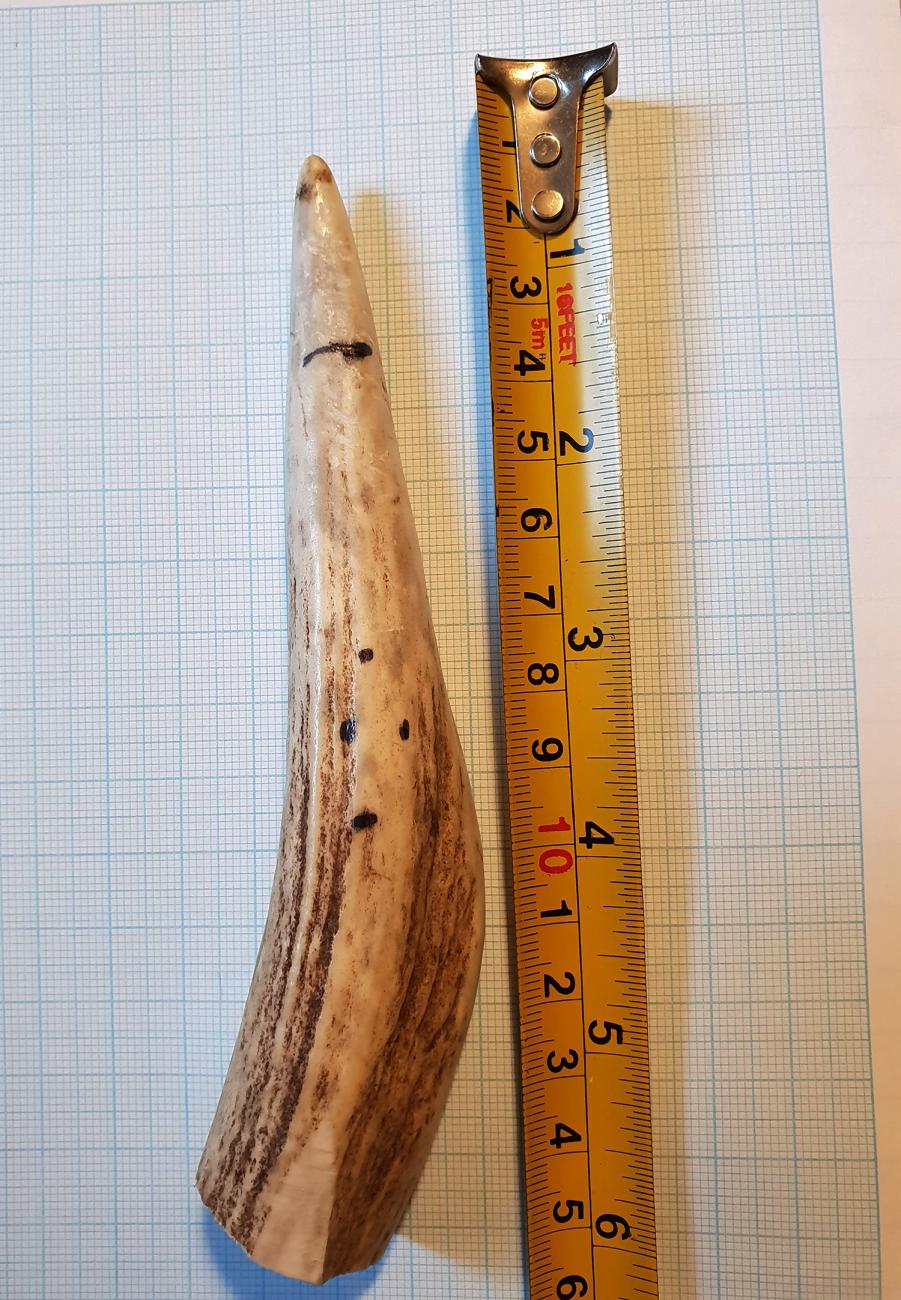 The only species of deer known to exist in pre-Norman Ireland was Cervus elaphus, the Red Deer (Carden, et al., 2012) so it was imperative to source tines from this species, to create authentic bridle components. The choice was made to select two brow tines, closest in curvature to the Moynagh cheek-piece.