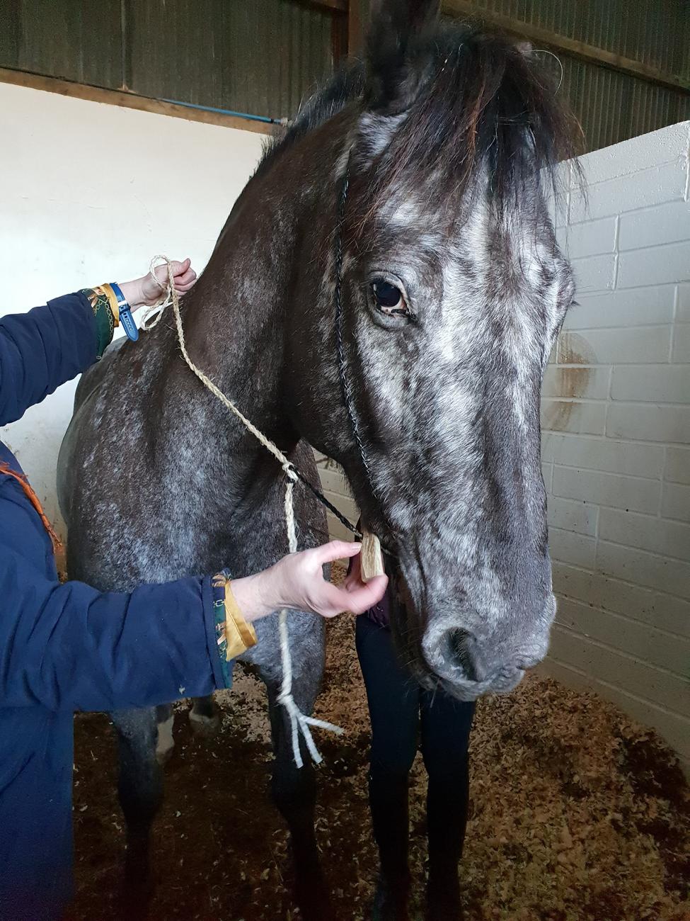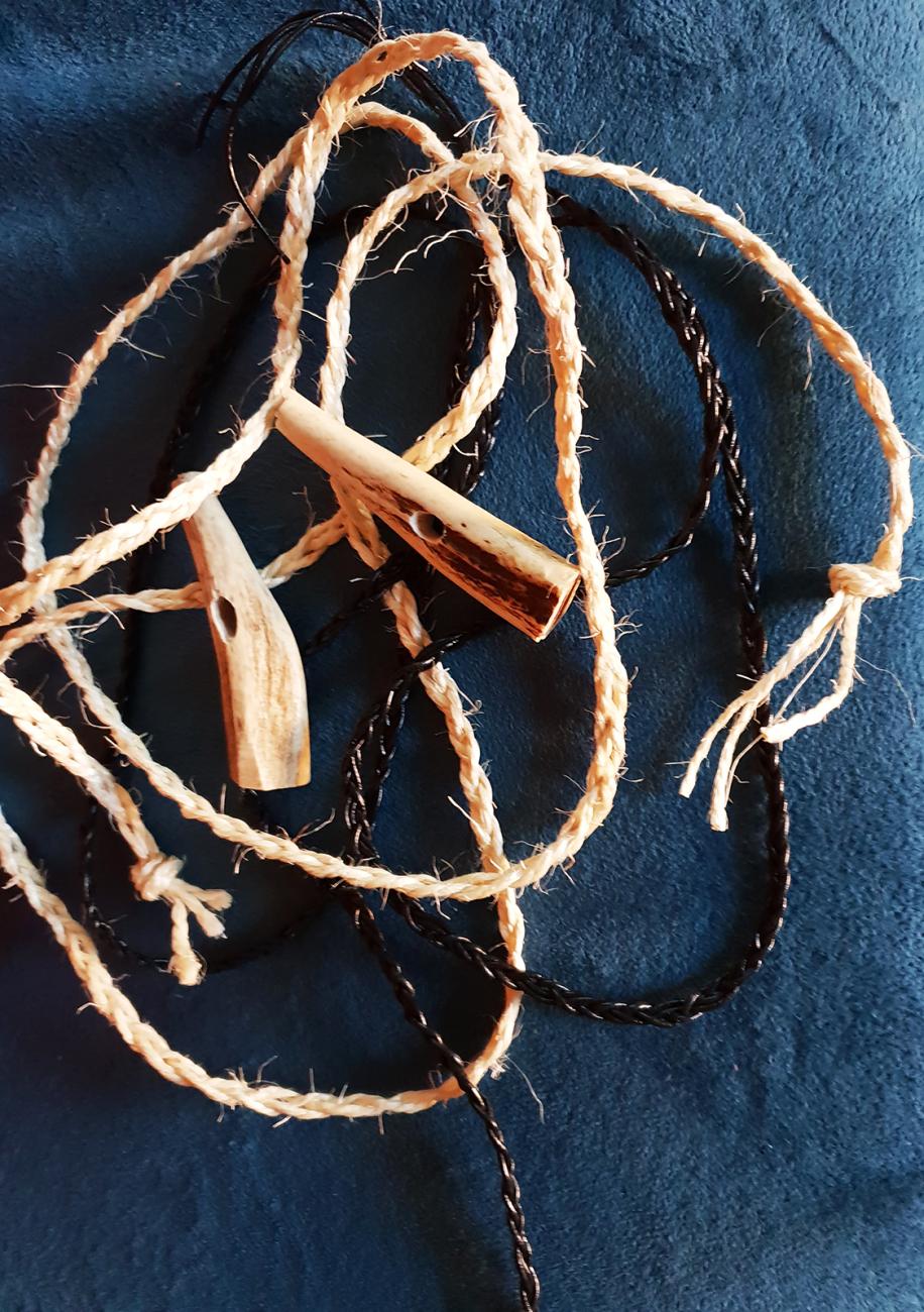 It was clear from the moment of fitting that the plaited leather mouthpiece was insufficient to control a modern horse, used to a metal bit. Both Roxy and Bertie expressed more of an interest in trying to crunch the antler cheek pieces on fitting, perhaps thinking them some exotic form of carrot! Using the plaited sisal rope which had been on stand-by as a chifney proved more successful as a mouthpiece, perhaps because its texture was more obvious to them as something new to be investigated and engaged with. These points were noted while leading the horses wearing the bridle around the sand-school, and I intend to replace the entire headstall with a plaited sisal and forego the leather for Mark II.