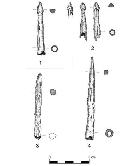The elements forged for this experimentation are replicas of heads 2 and 4 (See Figure 3) found in the medieval village Quattro Macine. These are both socketed heads and they have prism shaped tips (or bodkins), so they are definitely fighting heads. Head 2 has a triangular section bodkin and it has a total length of 48 mm, and a socket diameter of 8.8 mm, while head 4 has a long square section bodkin and it has a total length of 116 mm, and a socket diameter of 7.4 mm.