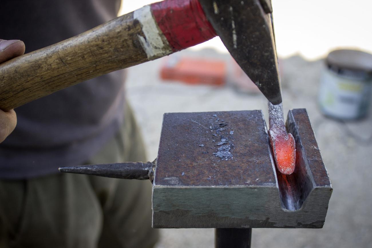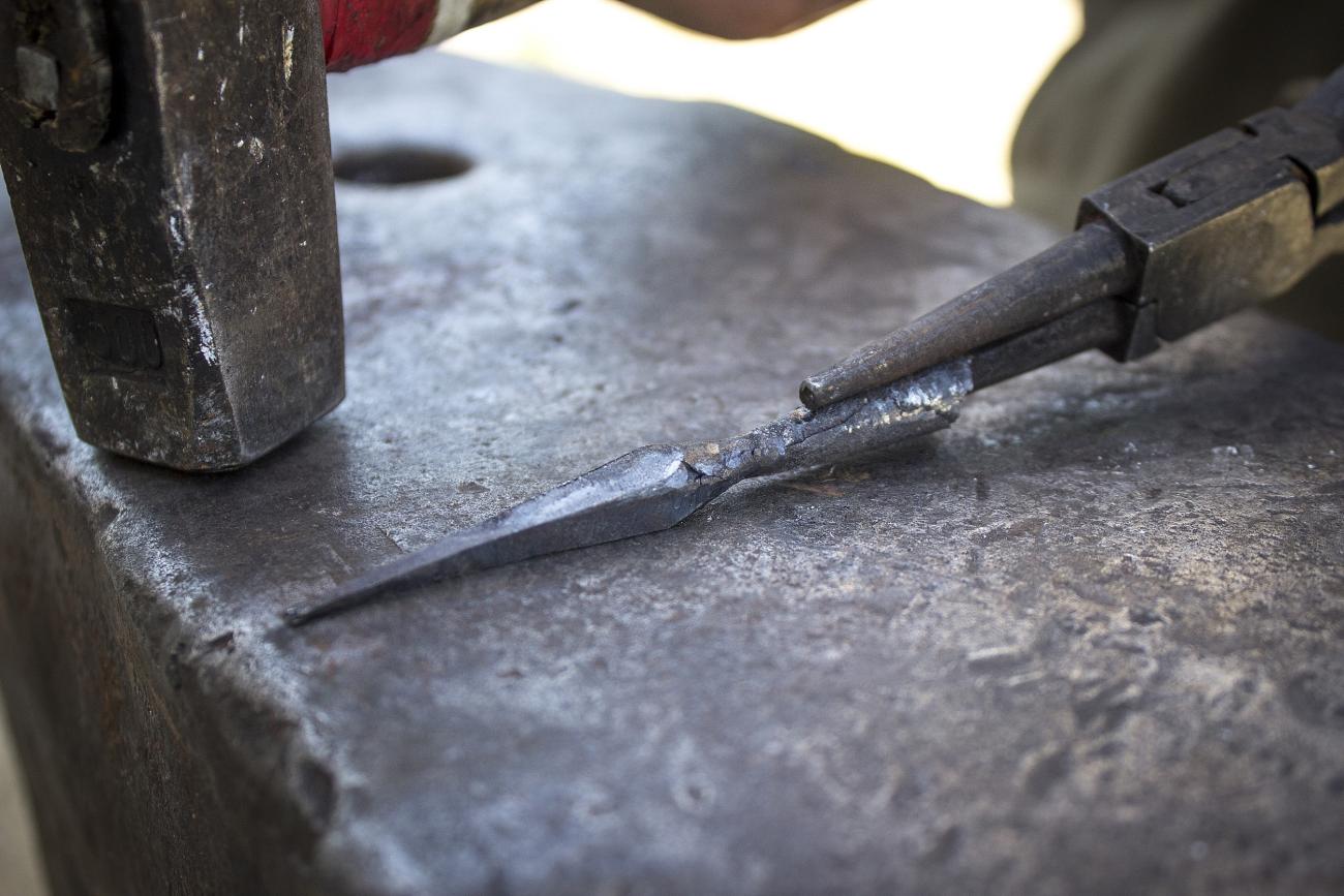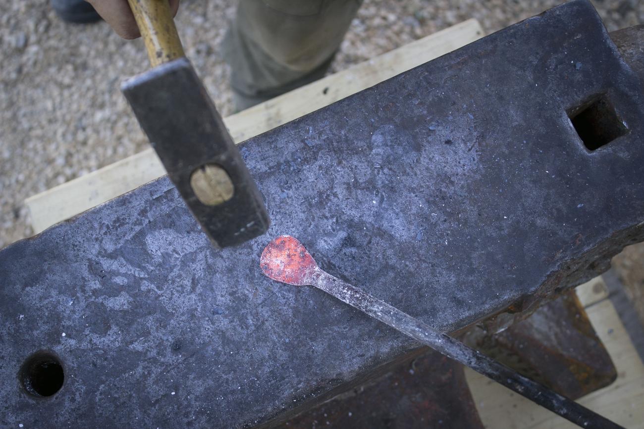 In addition to these tools, two hammers were used, respectively weighing 800 g and 500 g, as well as various tongs for specific processing steps. Hammers of different size are necessary for roughing and finishing phases.