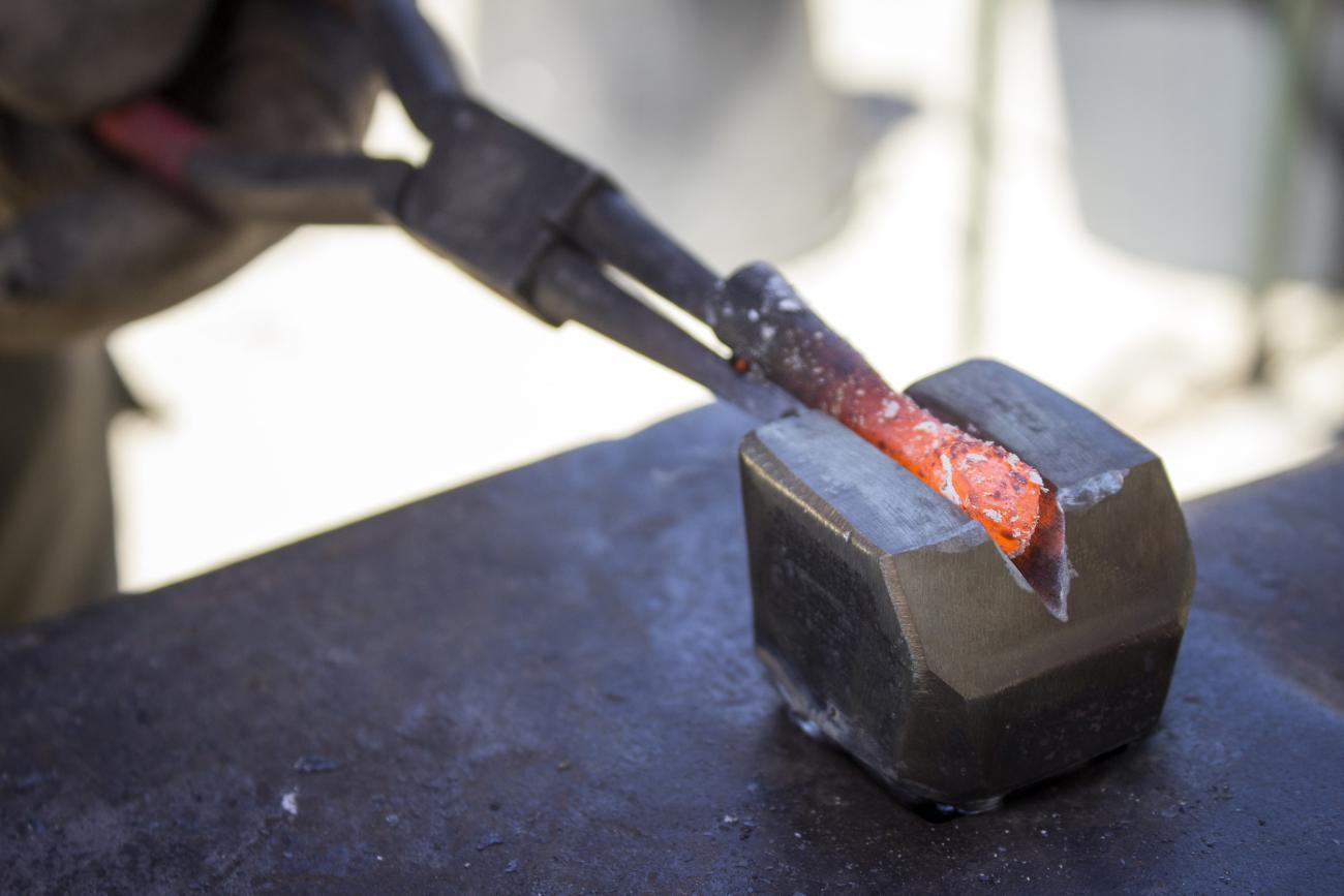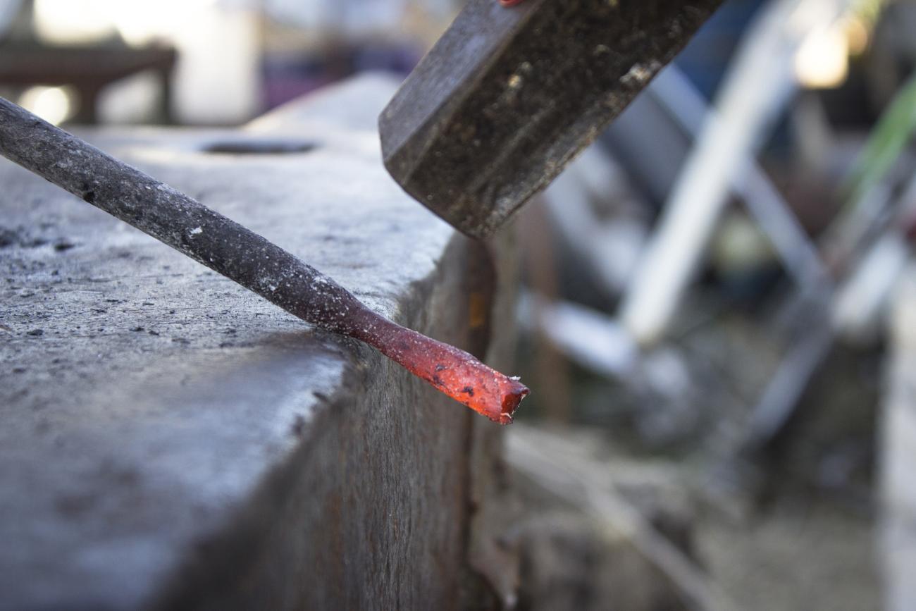 The hammering is the peculiar action through which the metal is deformed and shaped as desired by the blacksmith thanks to the impact of the hammer against the workpiece, held on the anvil, a block of very hard steel. This action does not consist, as many erroneously think, in a rough work represented by hammering randomly on the piece, but, on the contrary, it is an extremely complex process, consisting of hammering with intensity of strength and direction intentionally calibrated. This is the same for the choice of the hammer’s shape and weight, it has to be carefully chosen, according to the type of shape, or deformation, which the blacksmith wants to obtain from the piece worked.