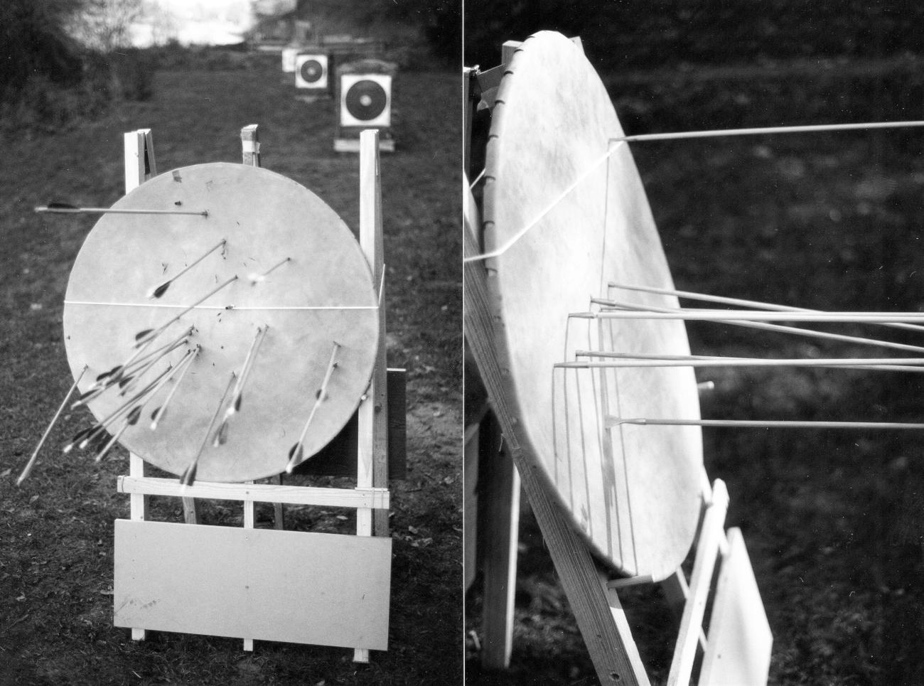 On the shooting ground a modern longbow made of fibre-reinforced cherry wood was used. The bow had a 72 pound draw weight and accelerated the arrows, which had shafts of pine wood, to a speed of 49 meters per second, measured 50 cm after arrow release. Depending on the design of the iron tips the arrows weighed between 40 and 48 grams. The shooting distance towards the shields was 15 meters.