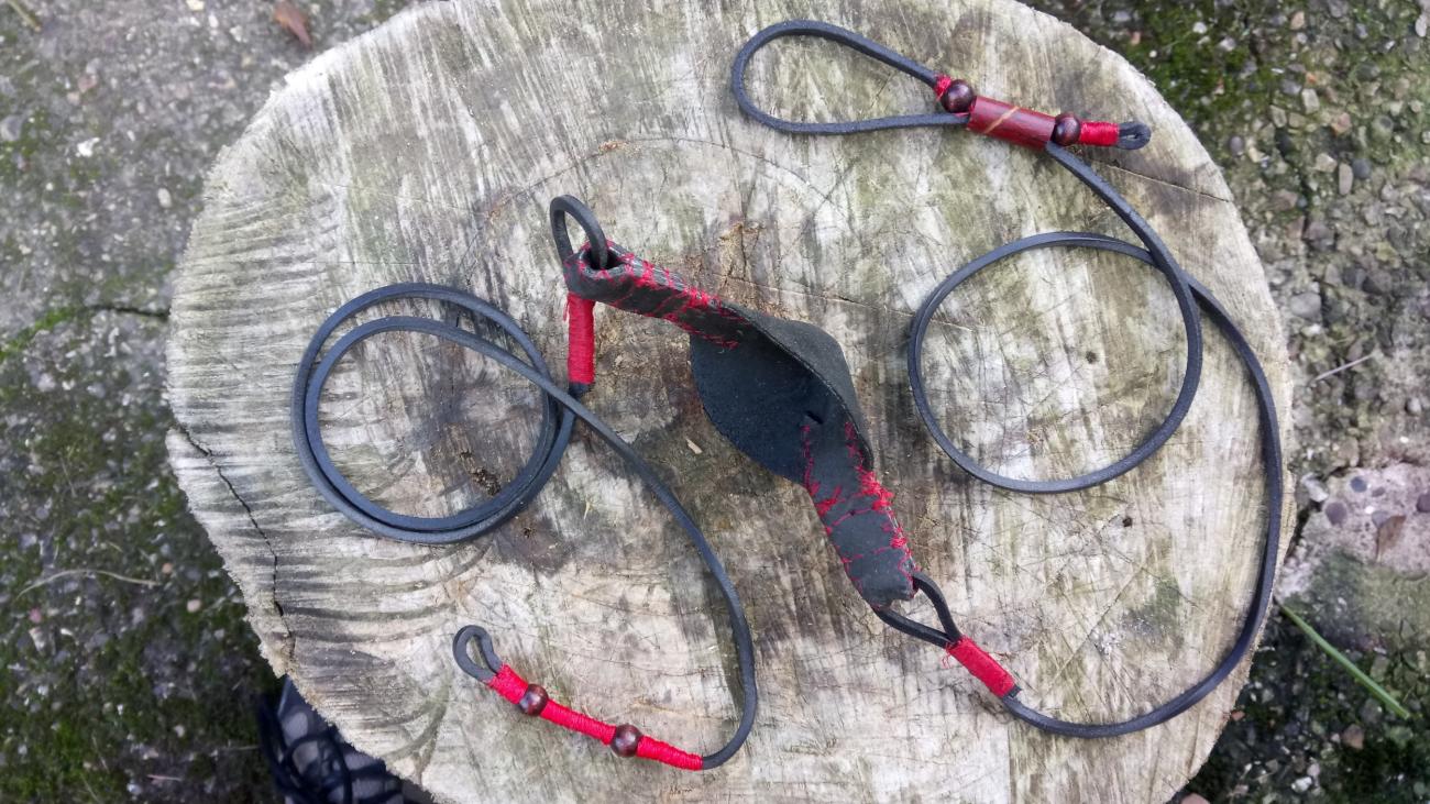 Before constructing the experimental sling, two different prototypes were created from thin cow leather and paracord to work out the most effective design. Both comprised of different loading pouches, the first was a wide strap, the second a circular cup shape; the second proving to be the better design to secure shot.