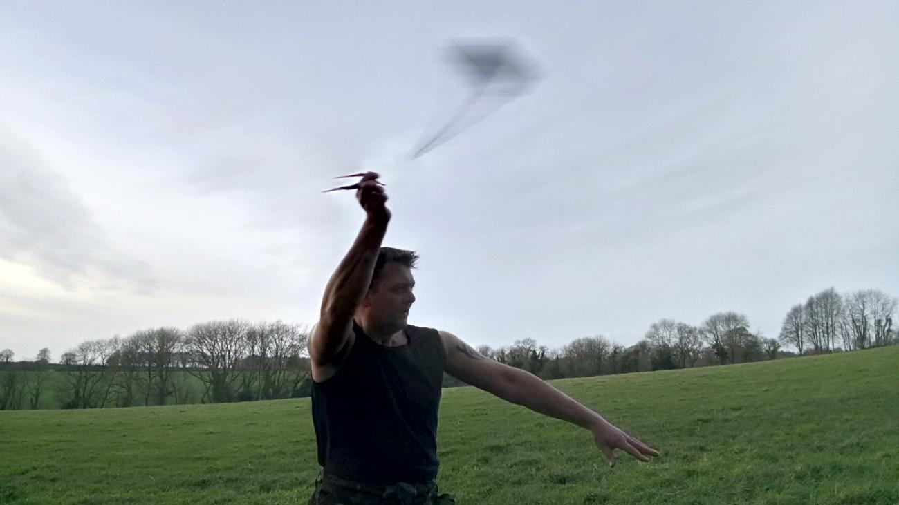 The purpose of this experiment was to examine the shepherd sling to form an understanding as to why it would appear to be the most dominant missile weapon of Iron Age Britain (Harding, 2012, p.194). The experiment consisted of making and using the sling, testing its range and accuracy to reveal its strengths and limitations. This experiment was also intended to introduce a different interpretation from previous experiments which have been conducted by both, professional slingers and novices in the practical use of weaponry; each brought solid conclusions which suggested that the sling was hard to master and only used by professionals. What we must consider is that people of the Iron Age would have been very practically minded with transferable skills, potentially; making the use of the sling much easier for the common person of this period. As I am a qualified weapons expert in Kobujutsu and Ninjutsu, I intended to put this theory to the test and see if my skills were transferable. Within these disciplines, chained or roped weaponry are used as climbing aids or to trap, ensnare and even throw at opponents (Hayes, 1981, pp.69-76), additionally; bladed implements of all types are also taught to be thrown (Hatsumi, 1981, pp.165-77). My aim was to combine the swinging technique of a chain, followed by a throwing technique to understand the dynamics of how to use a sling; challenging the theory that the sling was difficult to master and filling the void from previous perspectives.