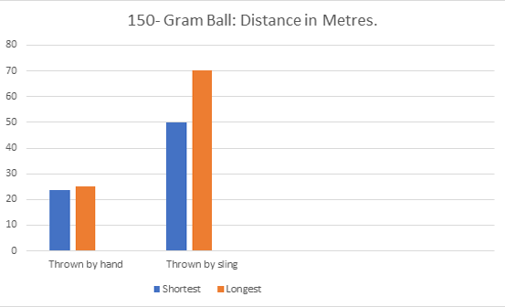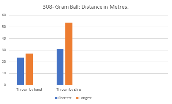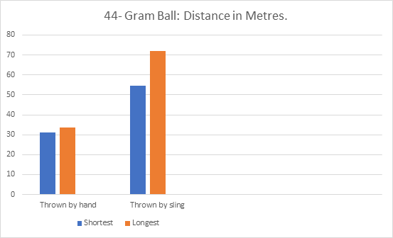 | Outcome: | Although we can clearly see that the additional weight had affected the range thrown by hand, reducing the distance by 20%, surprisingly; the longest distance via the sling was almost the same as a shot weighing 70% less (See Graph 2). |